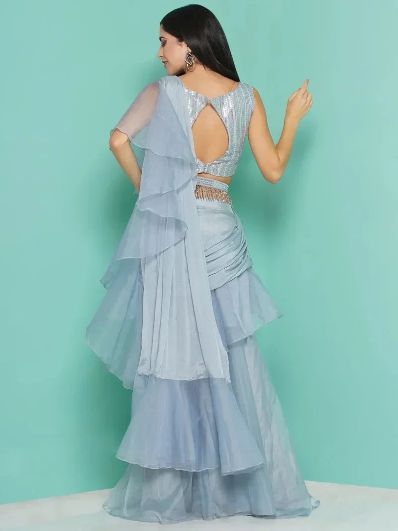 Soft grey sequin saree drape with organza frill , sequin blouse and beaded belt.