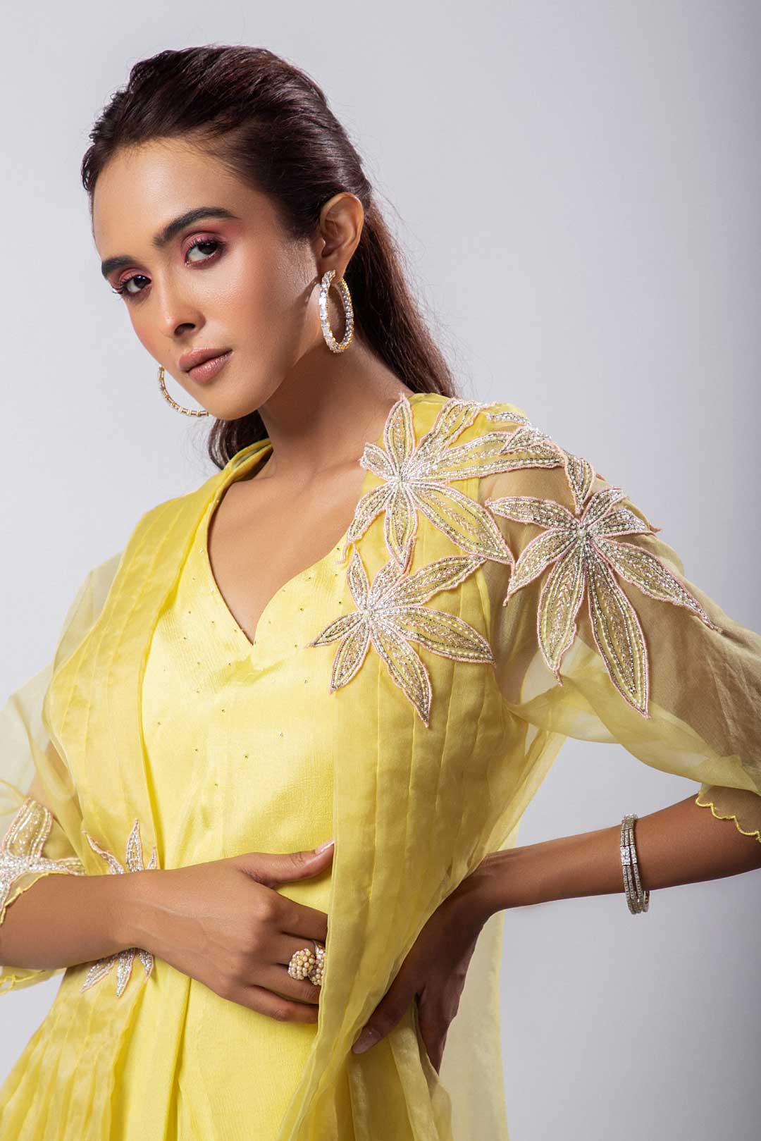 Drawing inspiration from the mesmerizing floral structures, this asymmetric dress with an embroidered jacket is a masterful blend of handcraft and contemporary design. Embodied by the use of fine materials, this creation offers a story of wonder.