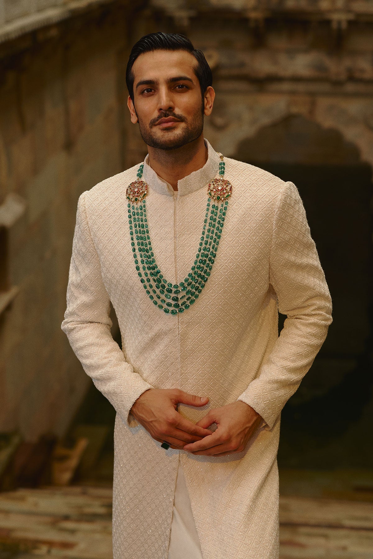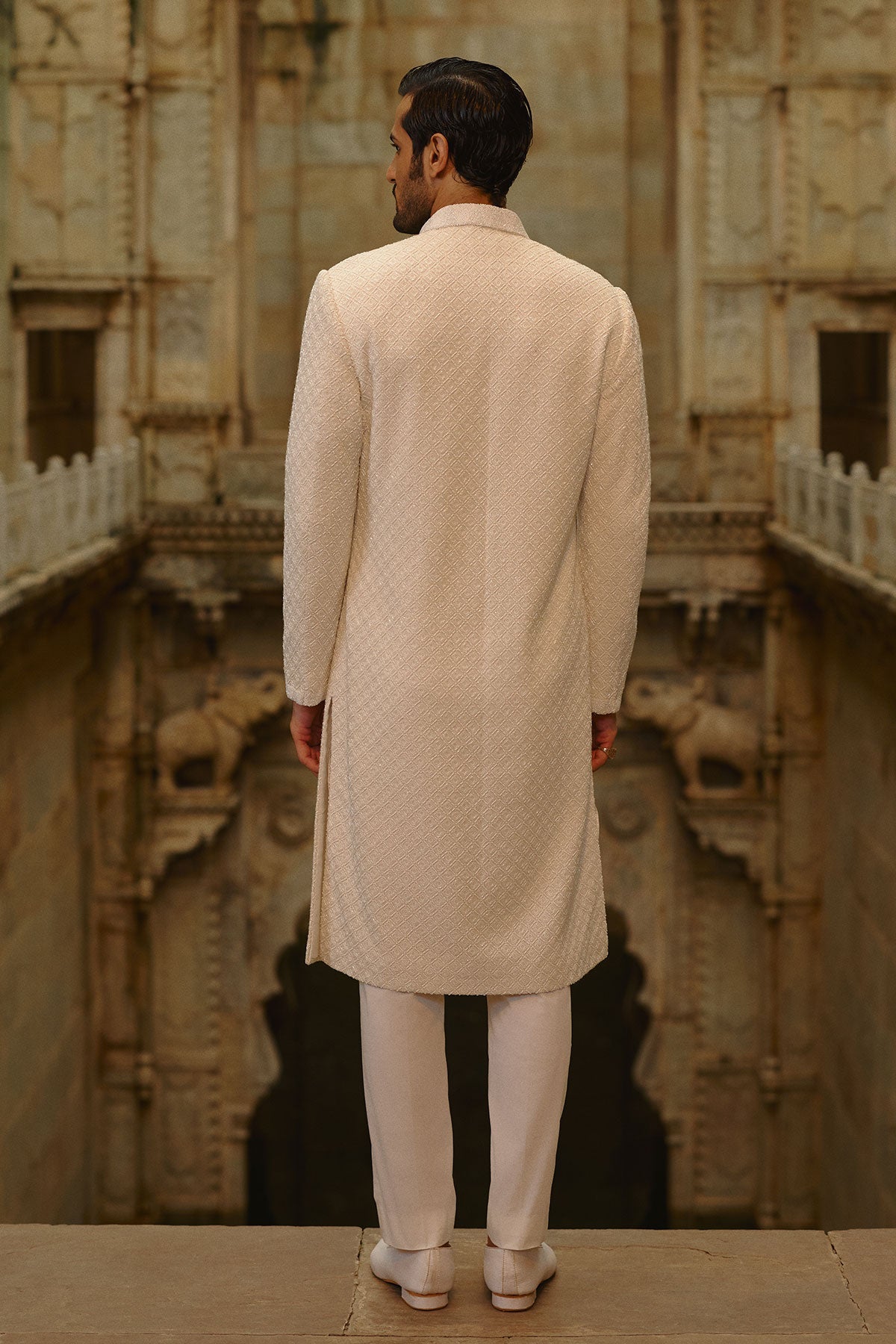 Ivory sherwani all over embroidered in geometric pattern with resham dabka and beadwork with cotton silk kurta and churidar.It comes with optional worked jutis