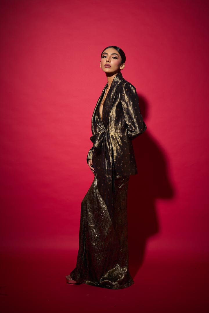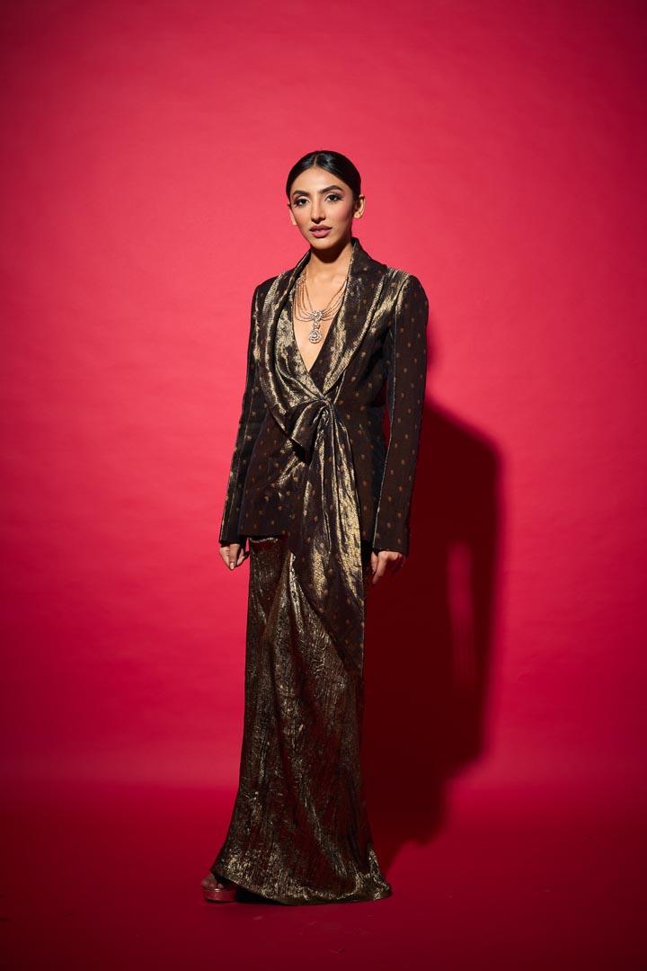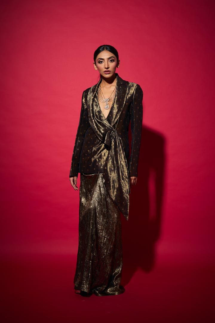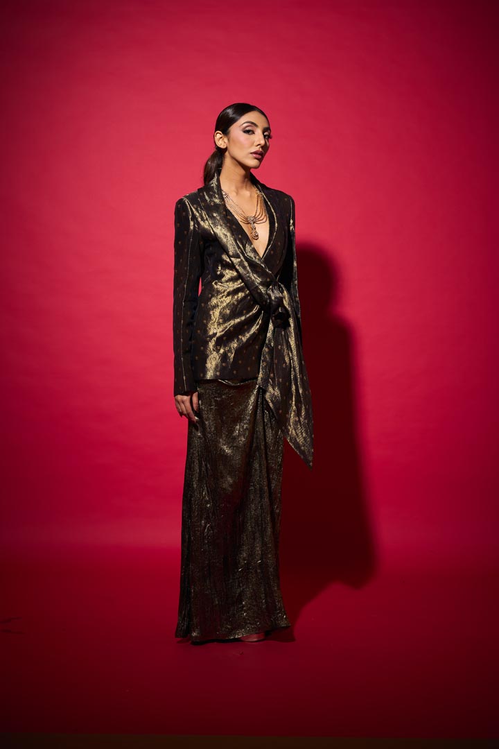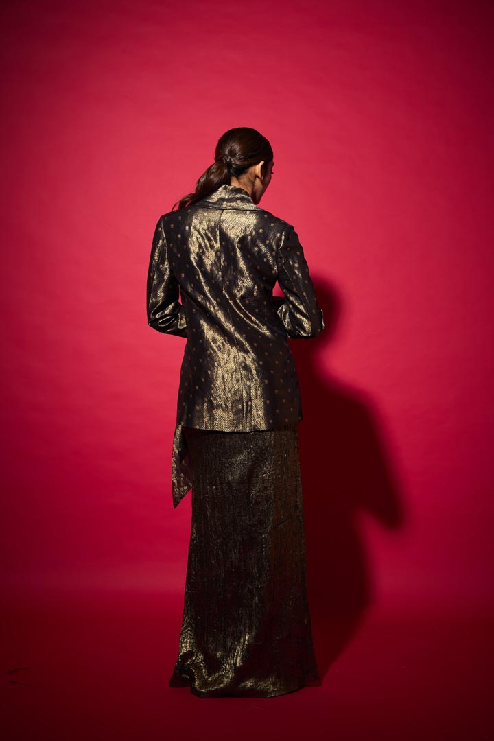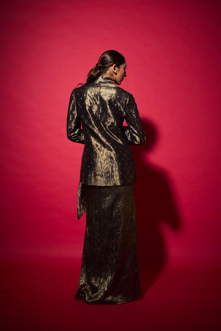 a stunning brocade silk blazer paired with a structured gold skirt. Royalty-core elegance that radiates power and poise.