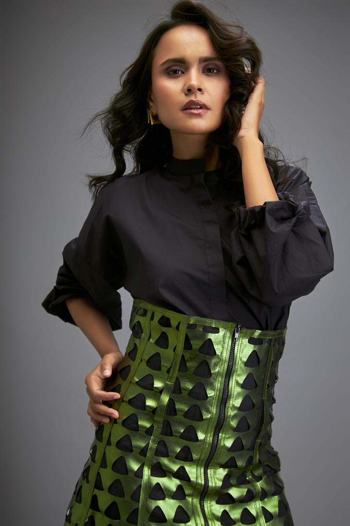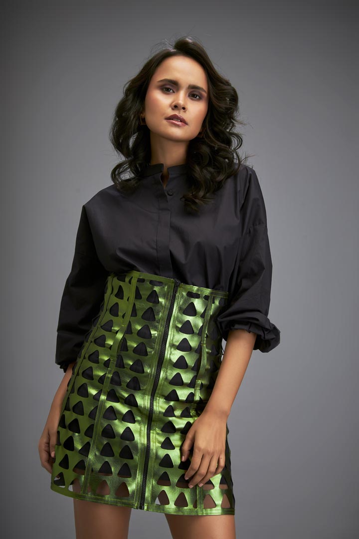 Black Shirt Paired With A Metallic Green Mini Skirt With Triangle Cutouts