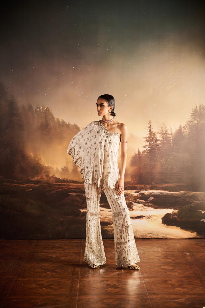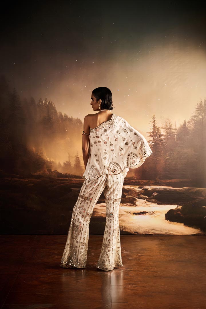This cape set makes a bold statement with a perfect blend of elegance. It features mirror work webbed with zari. This cape is seamlessly paired with bellbottom pants.