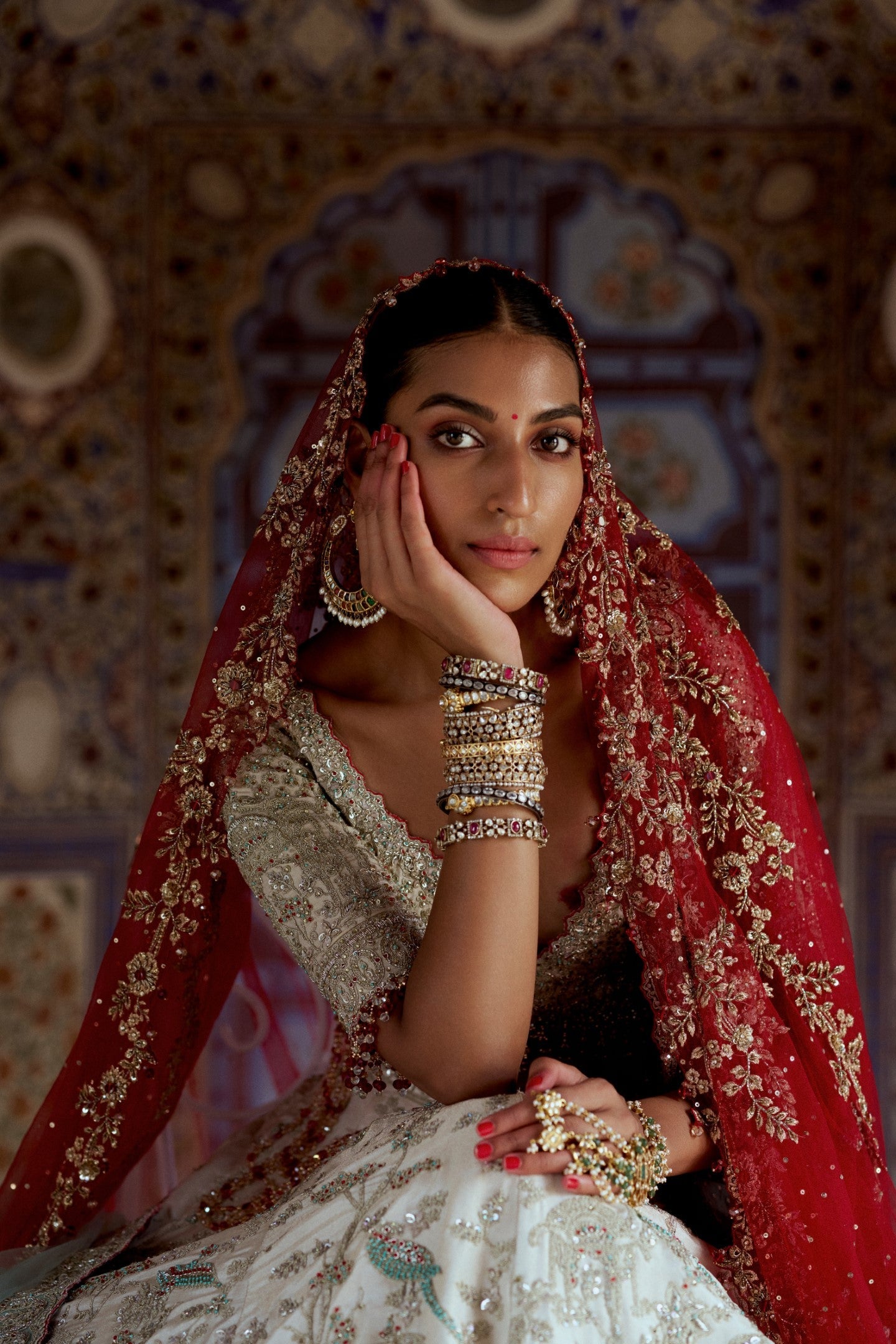 Silver tissue lehenga choli with an aqua net dupatta embroidered in silver dori highlighted with dabka, sequins, and red and aqua beads. It has an optional second red dupatta and a head veil that can be ordered separately.