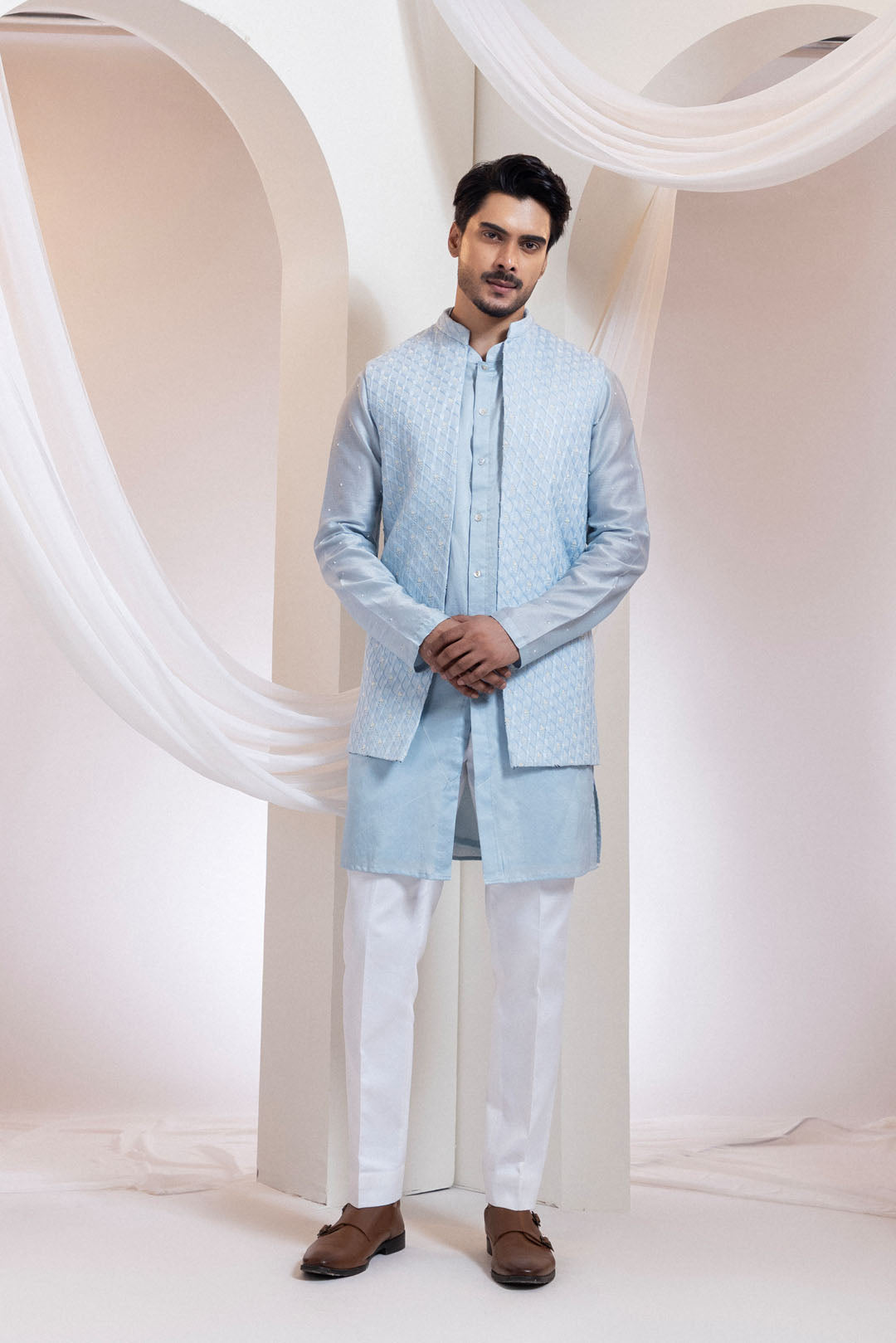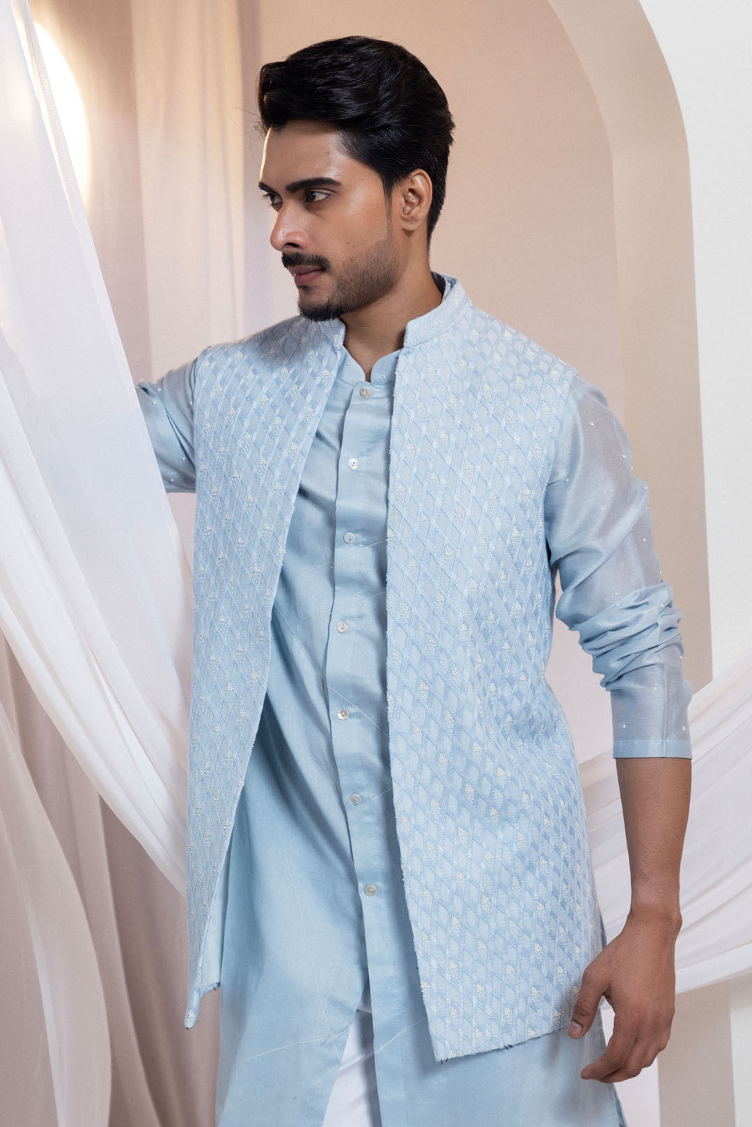 A refined sky-blue Nehru jacket featuring an all-over diamond-textured pattern crafted with tonal threadwork and filled with subtle bead detailing. The embroidery catches light with an understated gleam, adding dimension to the soft hue. Tailored with structure and clarity, this piece evokes the precision and brilliance of a cut diamond—ideal for daytime celebrations and elegant gatherings.