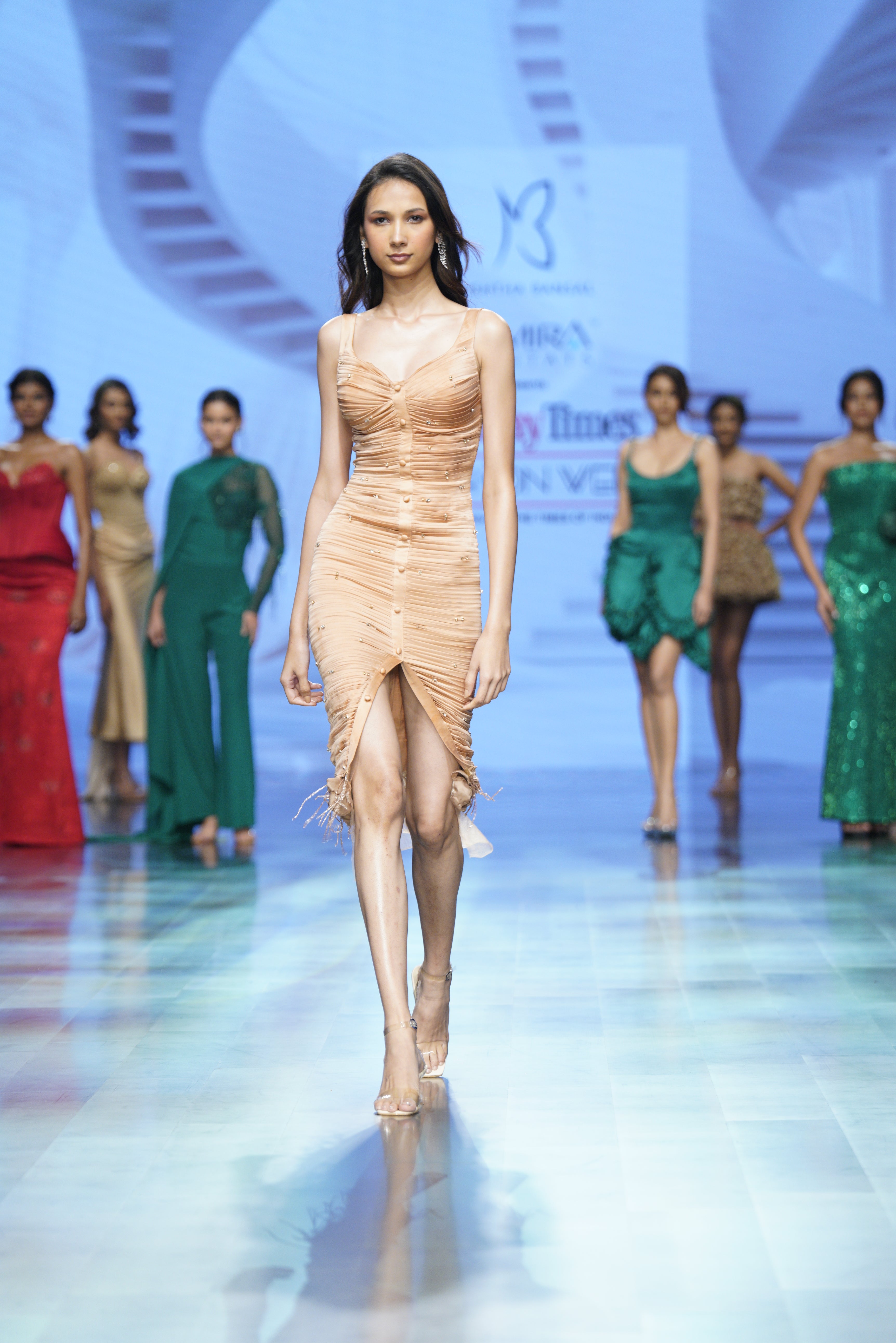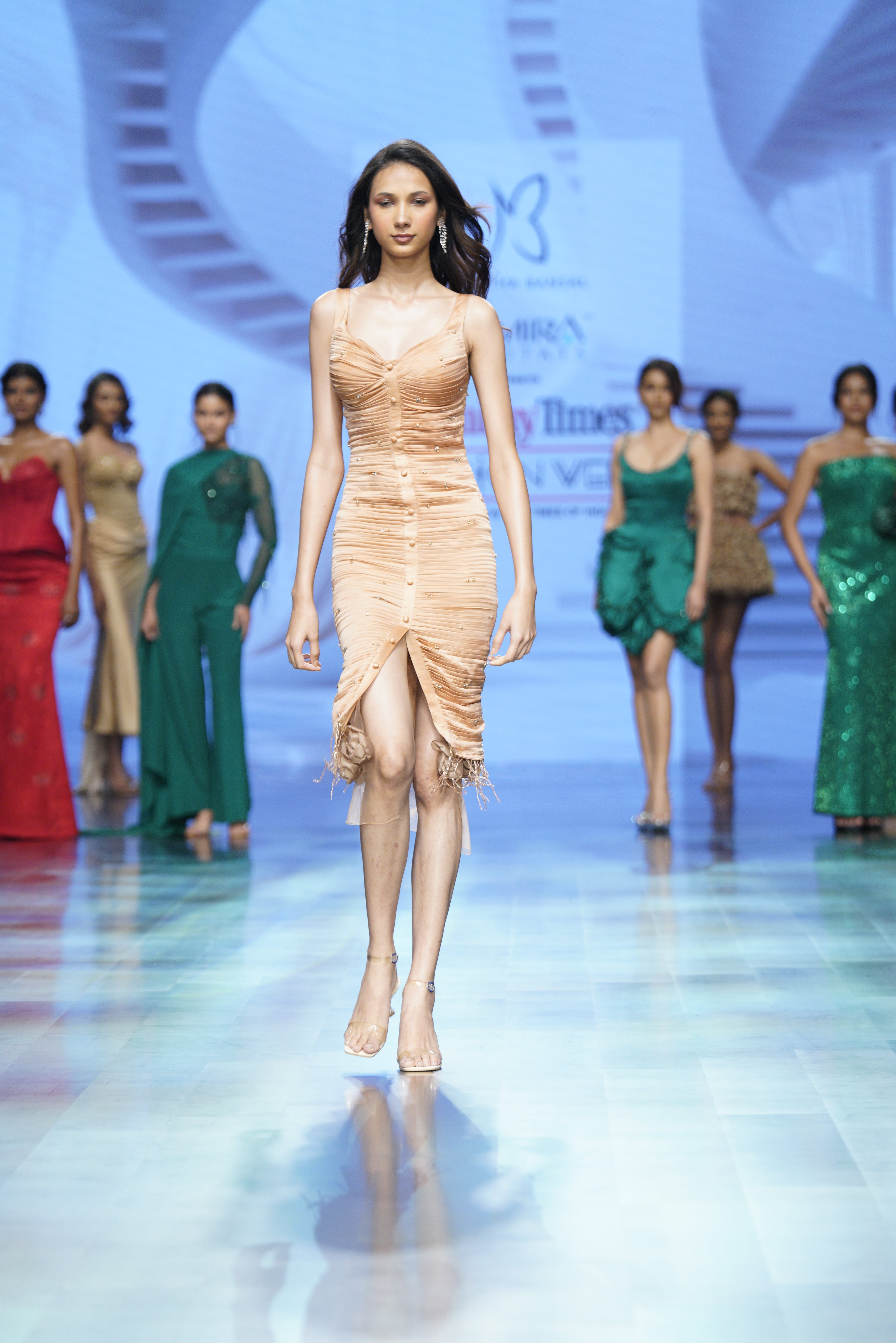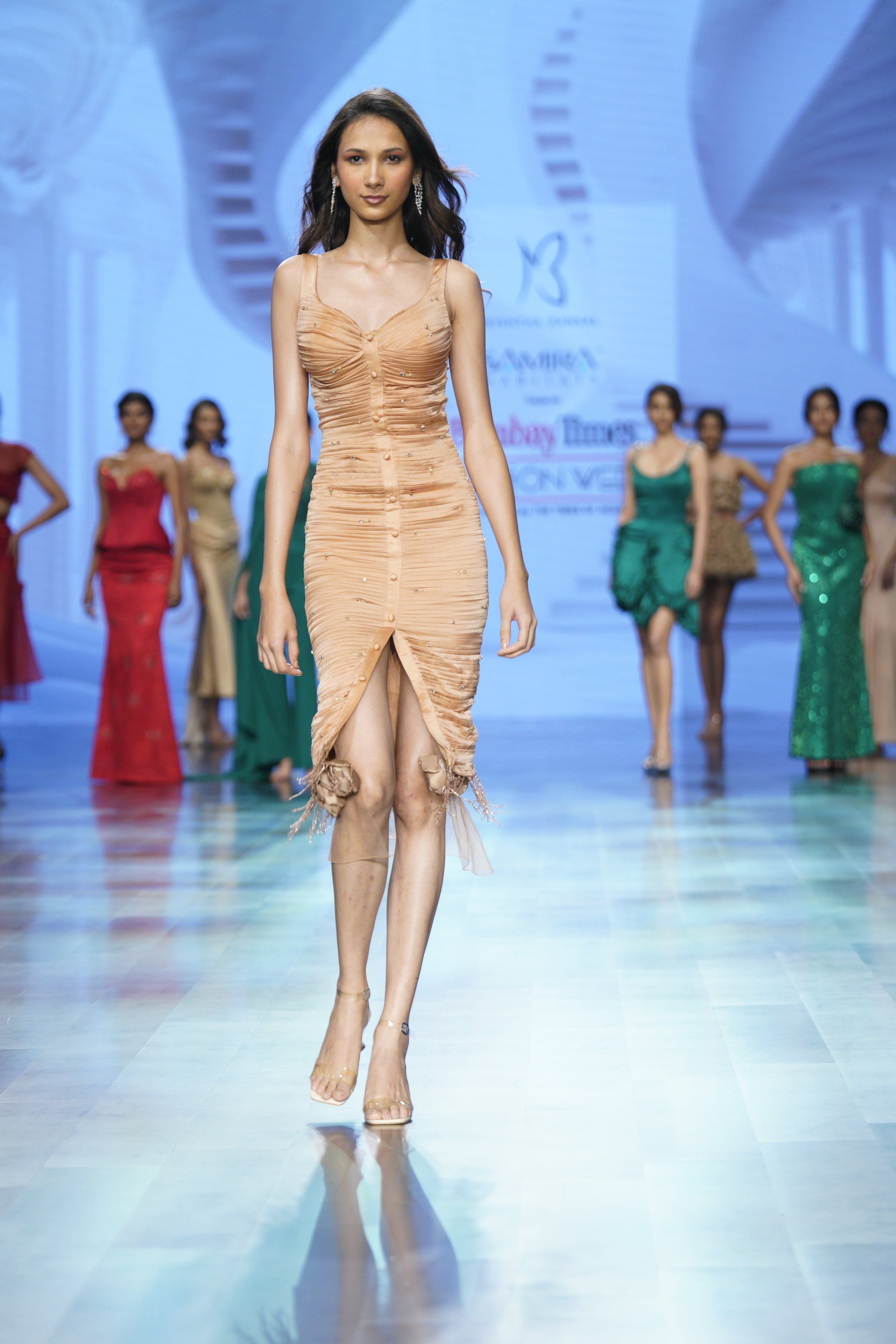 A sculpted satin silhouette with subtle pleats and peony accents—sensual, structured, and softly striking..