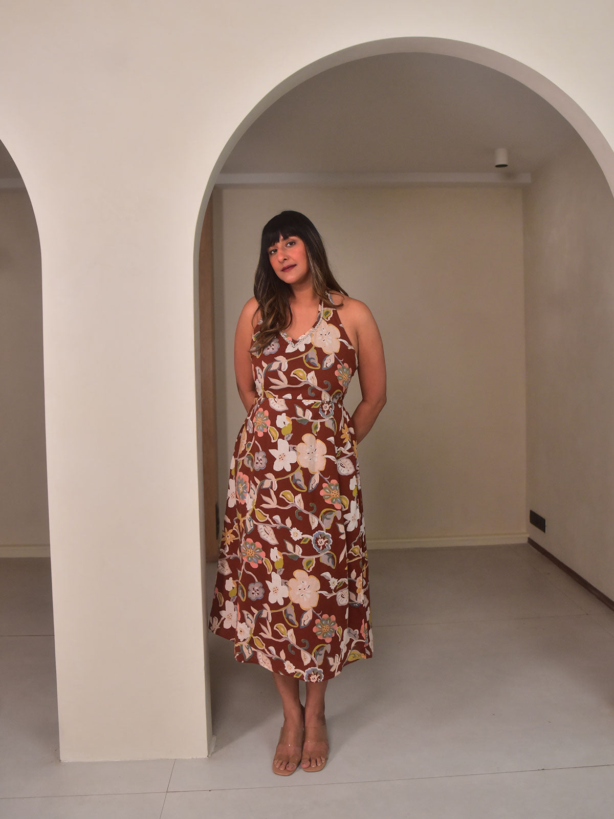 This halter neck midi dress is cut in our exclusive brown floral printed cotton, designed with a gentle flare and ecru net detailing at the neckline for subtle texture. Smocking at the back ensures a comfortable, flattering fit, while side pockets add everyday functionality. Perfect for warm daytime outings, vacations, or alfresco lunches. Pair with flat leather sandals and a woven bag for a breezy summer statement.