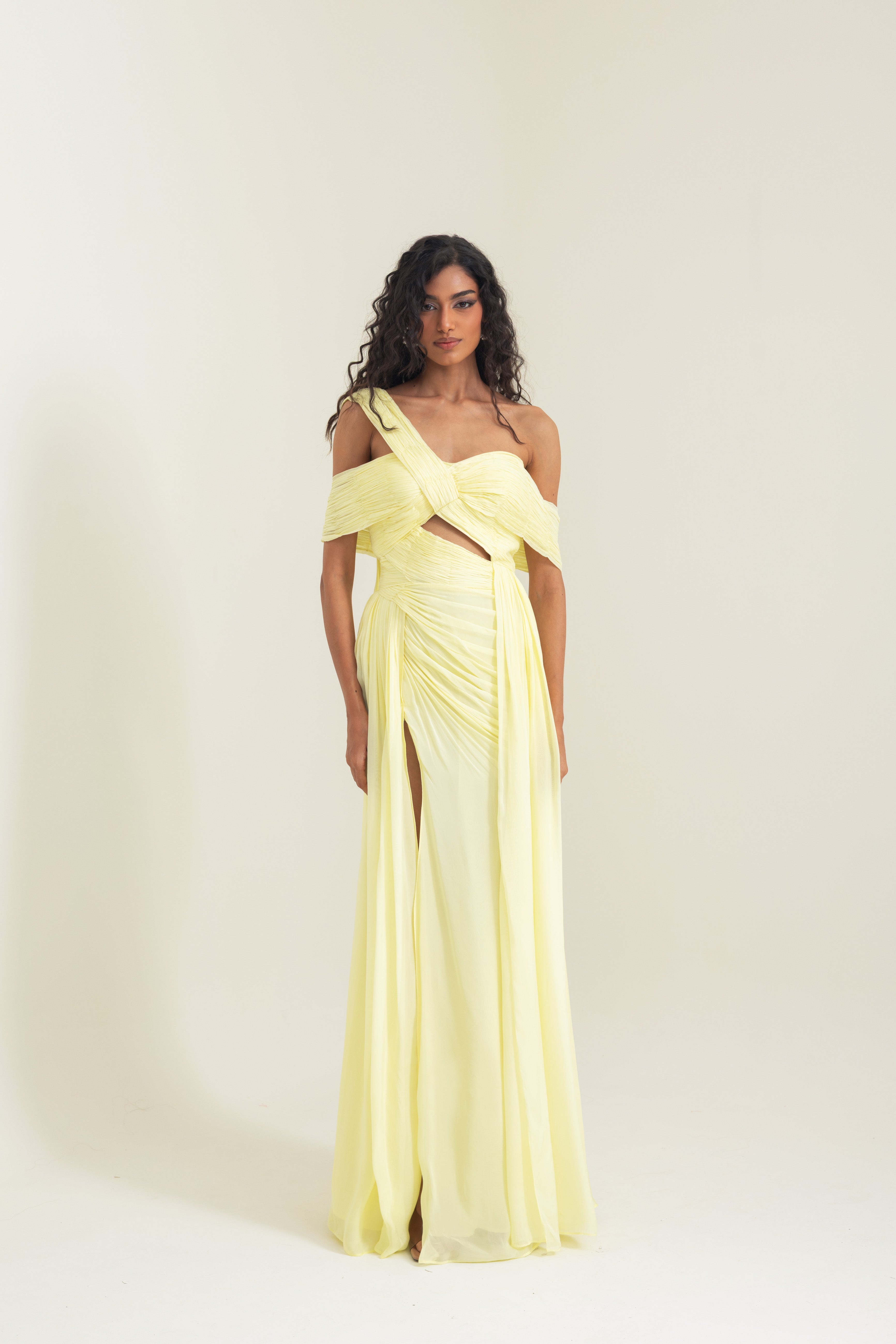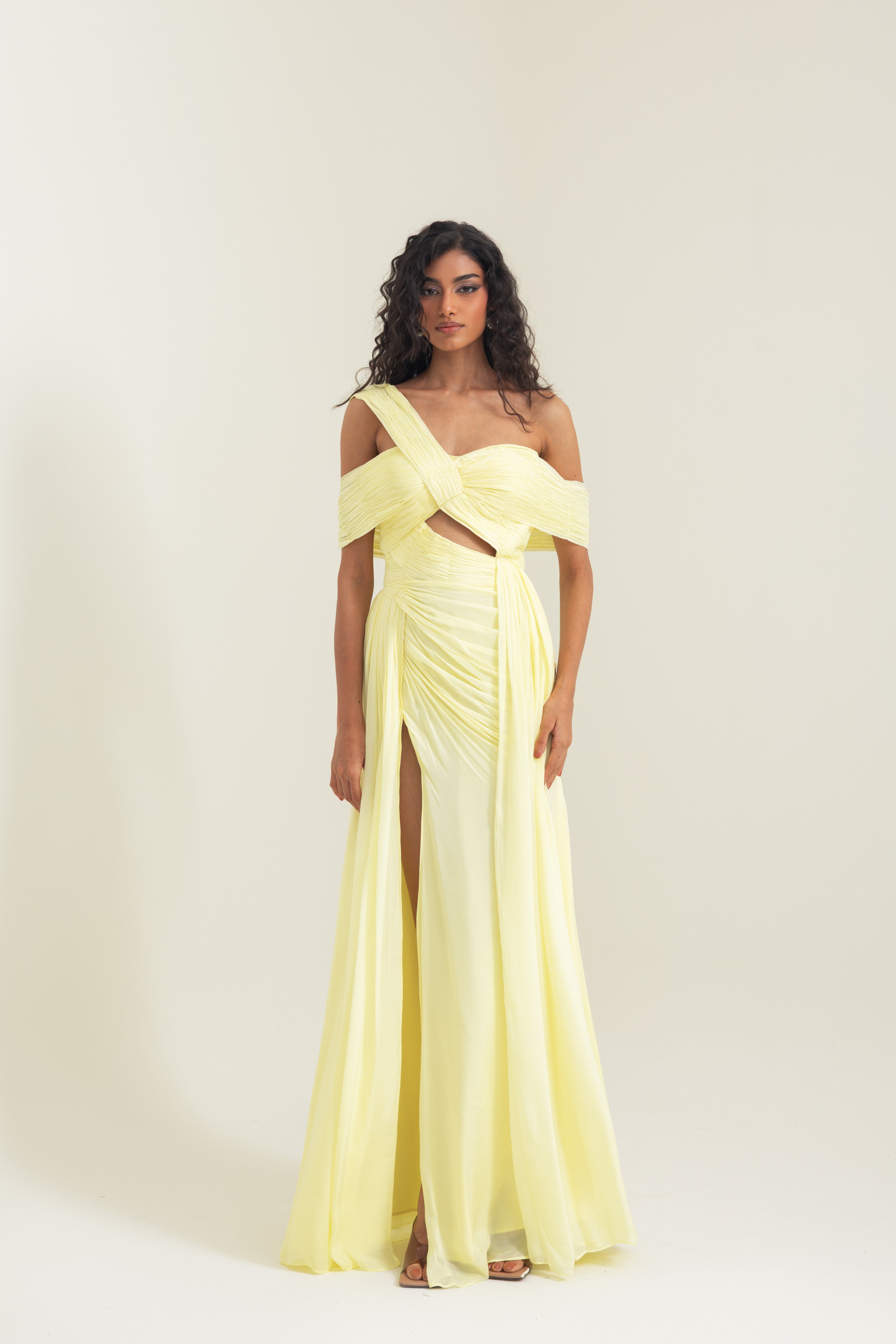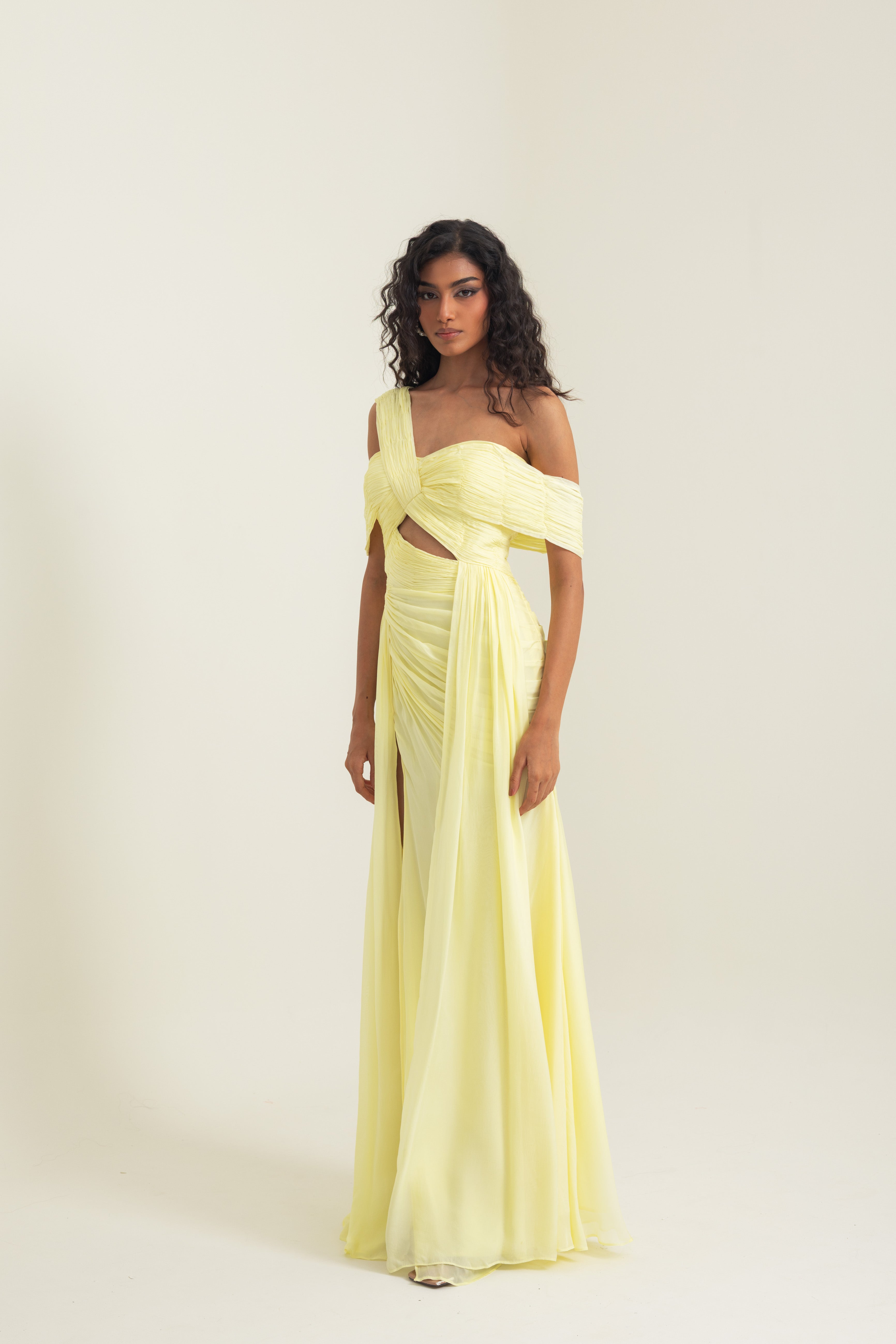 Ethereal Sorrento , this gown in butter yellow is crafted from airy flat chiffon, elevated with meticulous hand draping. The bodice features an off-shoulder asymmetric neckline with criss-cross detailing and a subtle cut-out that adds a hint of allure