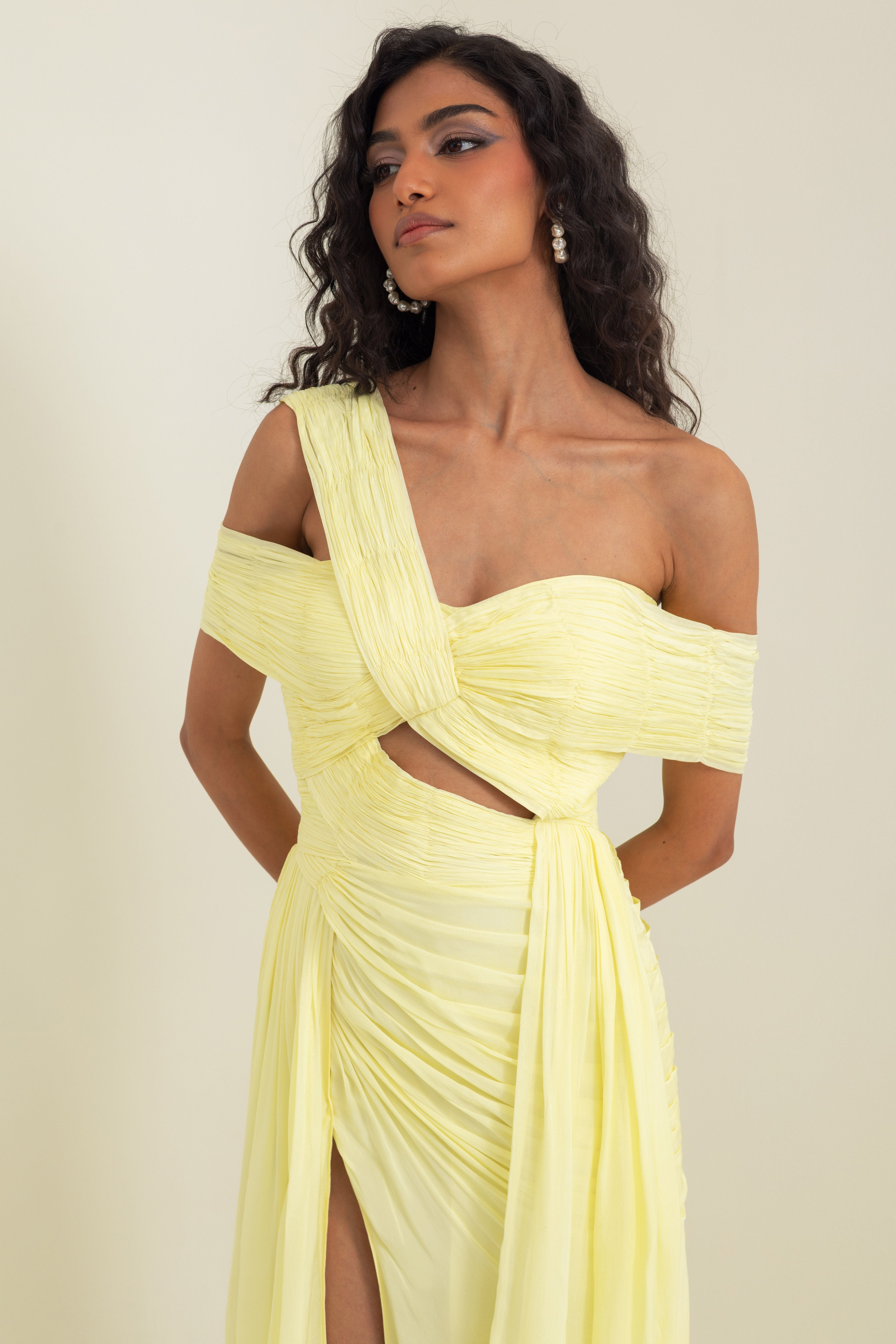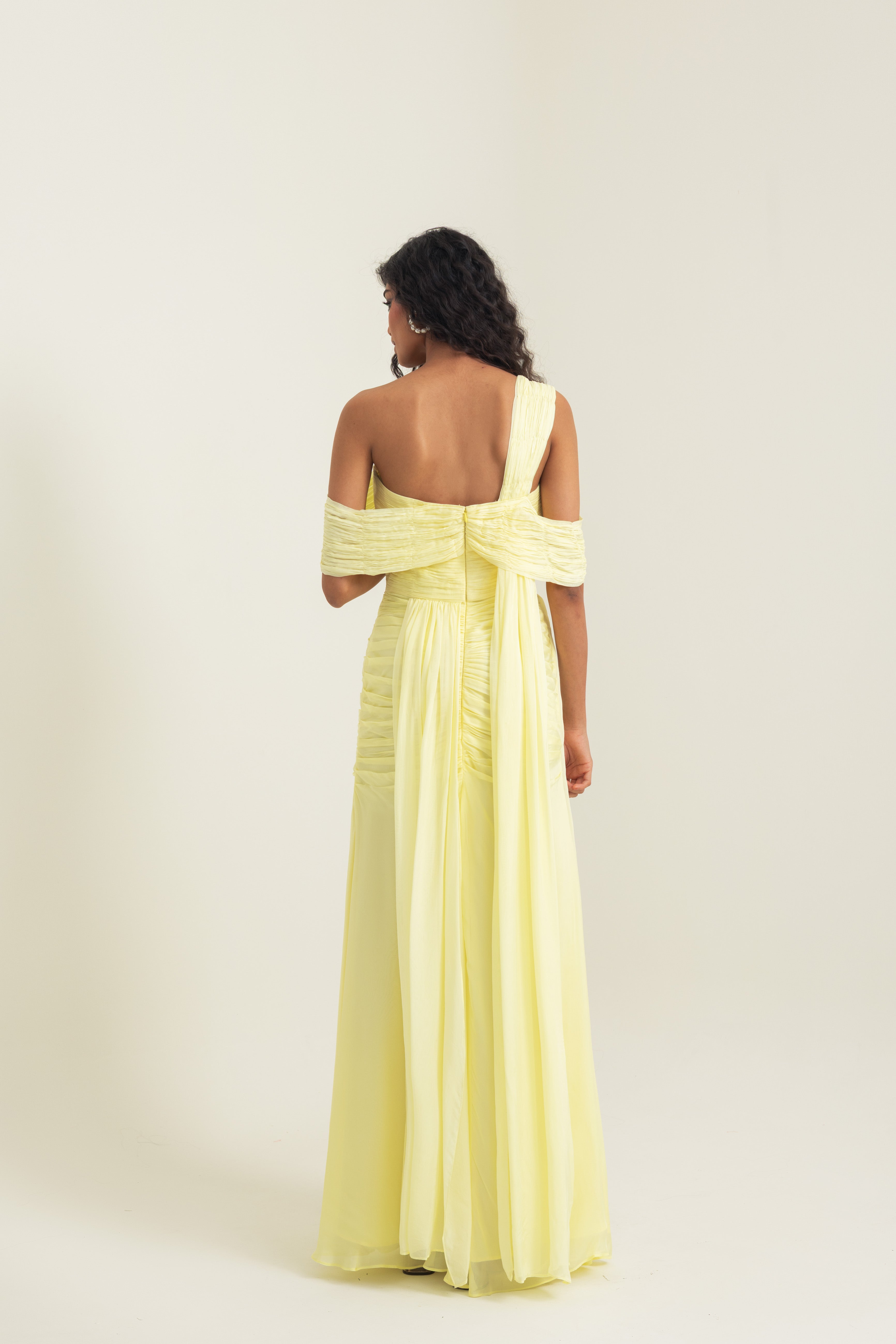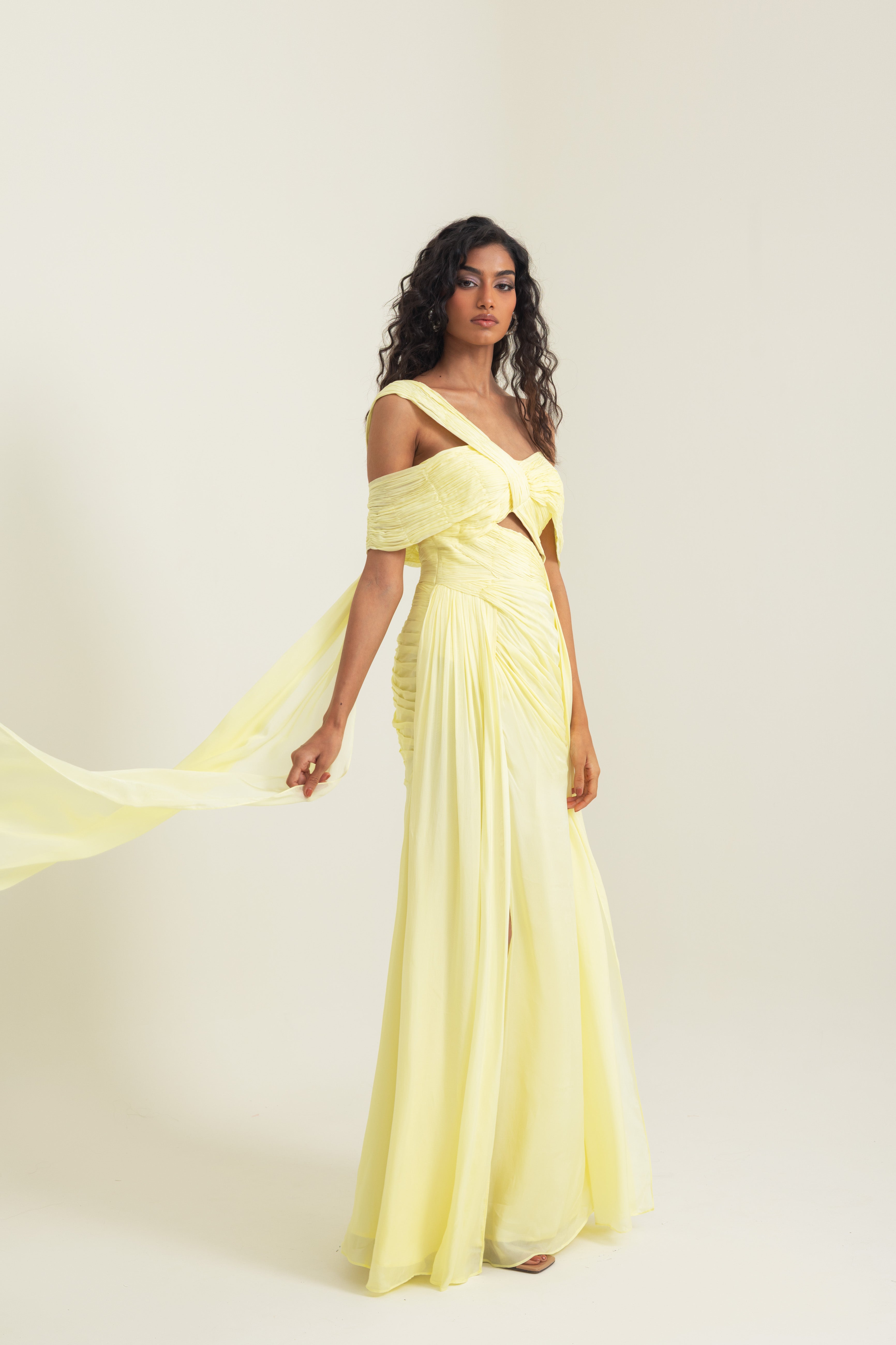 Ethereal Sorrento , this gown in butter yellow is crafted from airy flat chiffon, elevated with meticulous hand draping. The bodice features an off-shoulder asymmetric neckline with criss-cross detailing and a subtle cut-out that adds a hint of allure