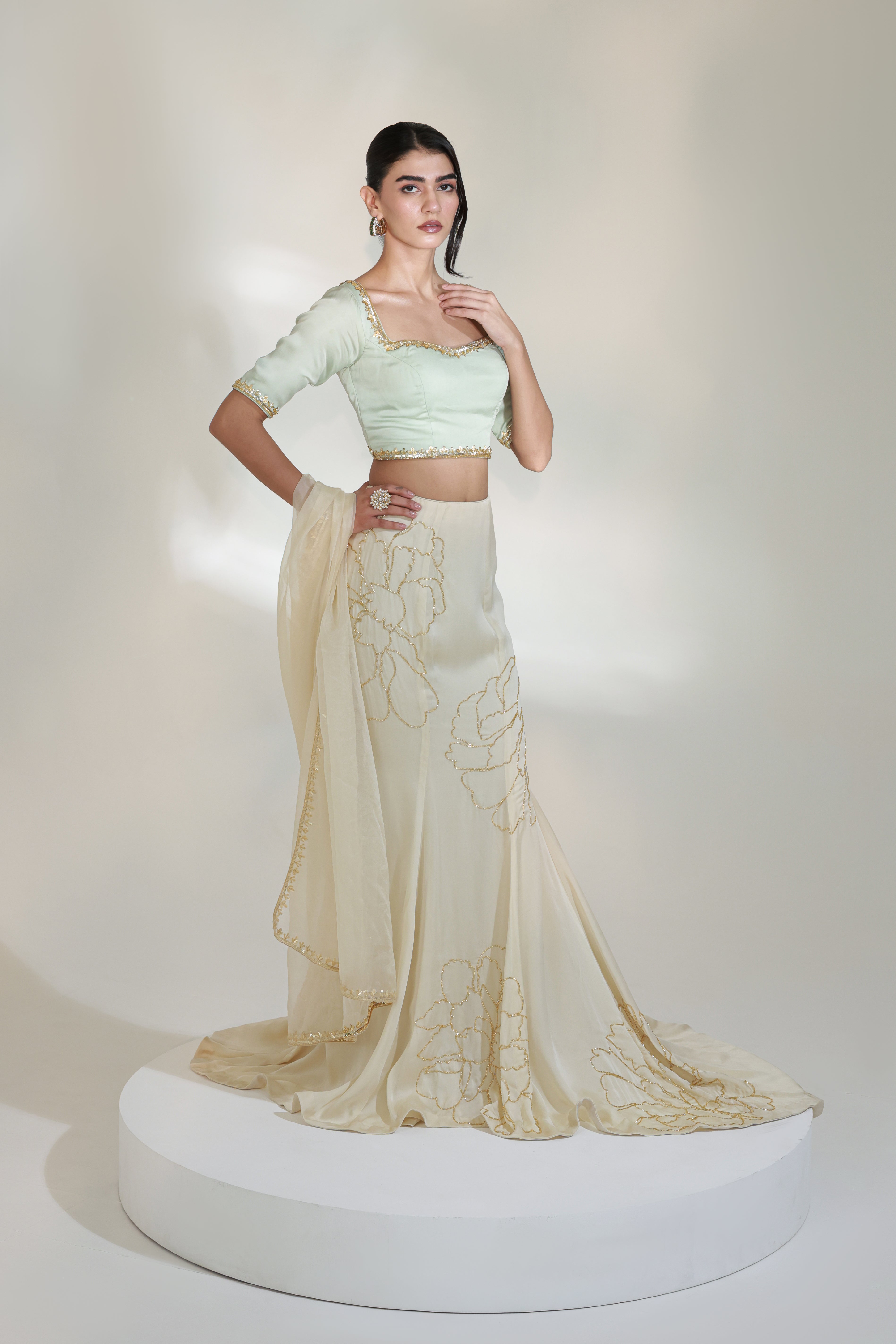 Graceful and commanding, this organza satin lehenga set is crafted for modern celebrations. The blouse is edged with delicate hand embroidery, mirrored on the dupatta borders for refined detail. The skirt blooms with intricately embroidered flowers placed in soft intervals, finished with an elegant trail that adds drama and movement.