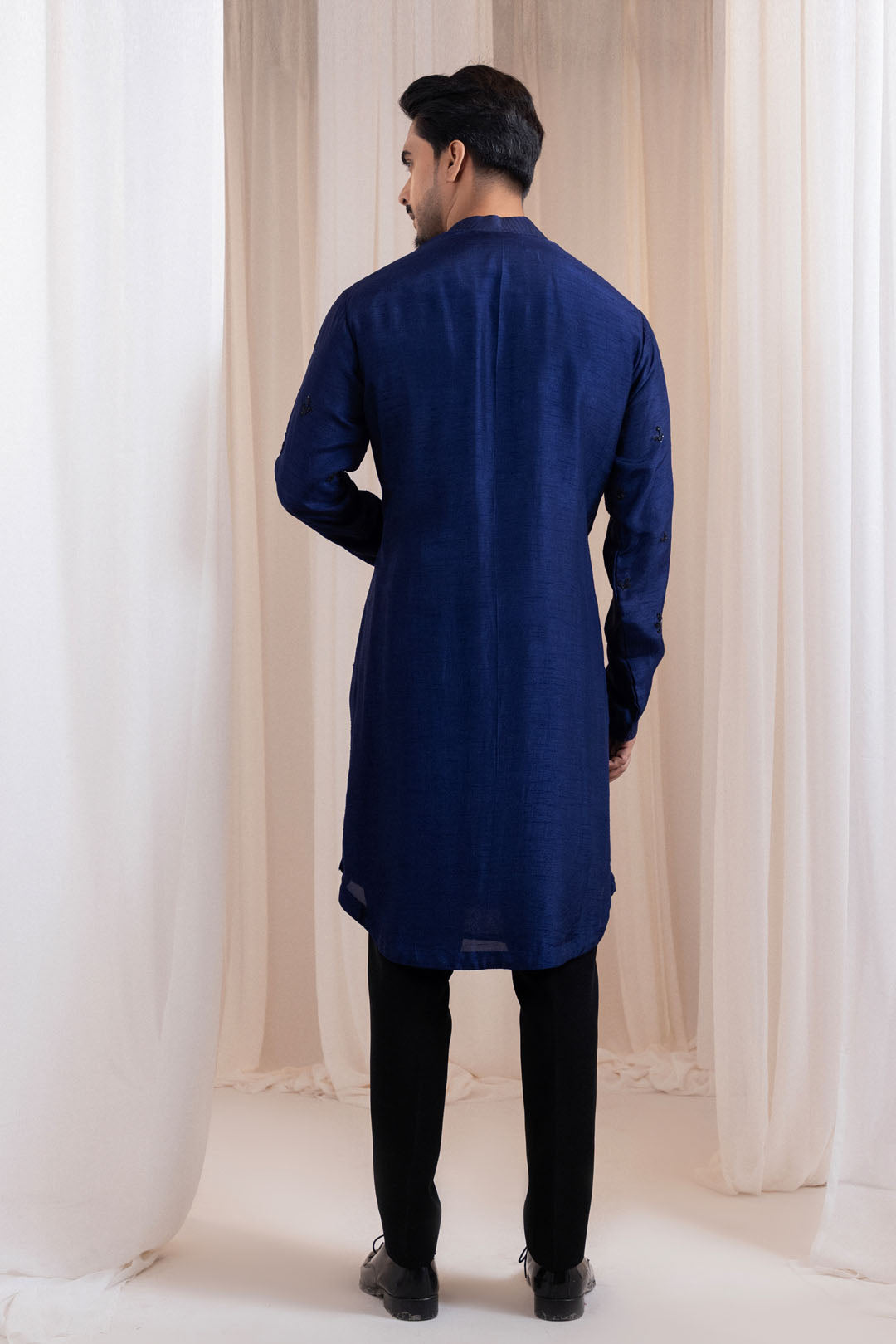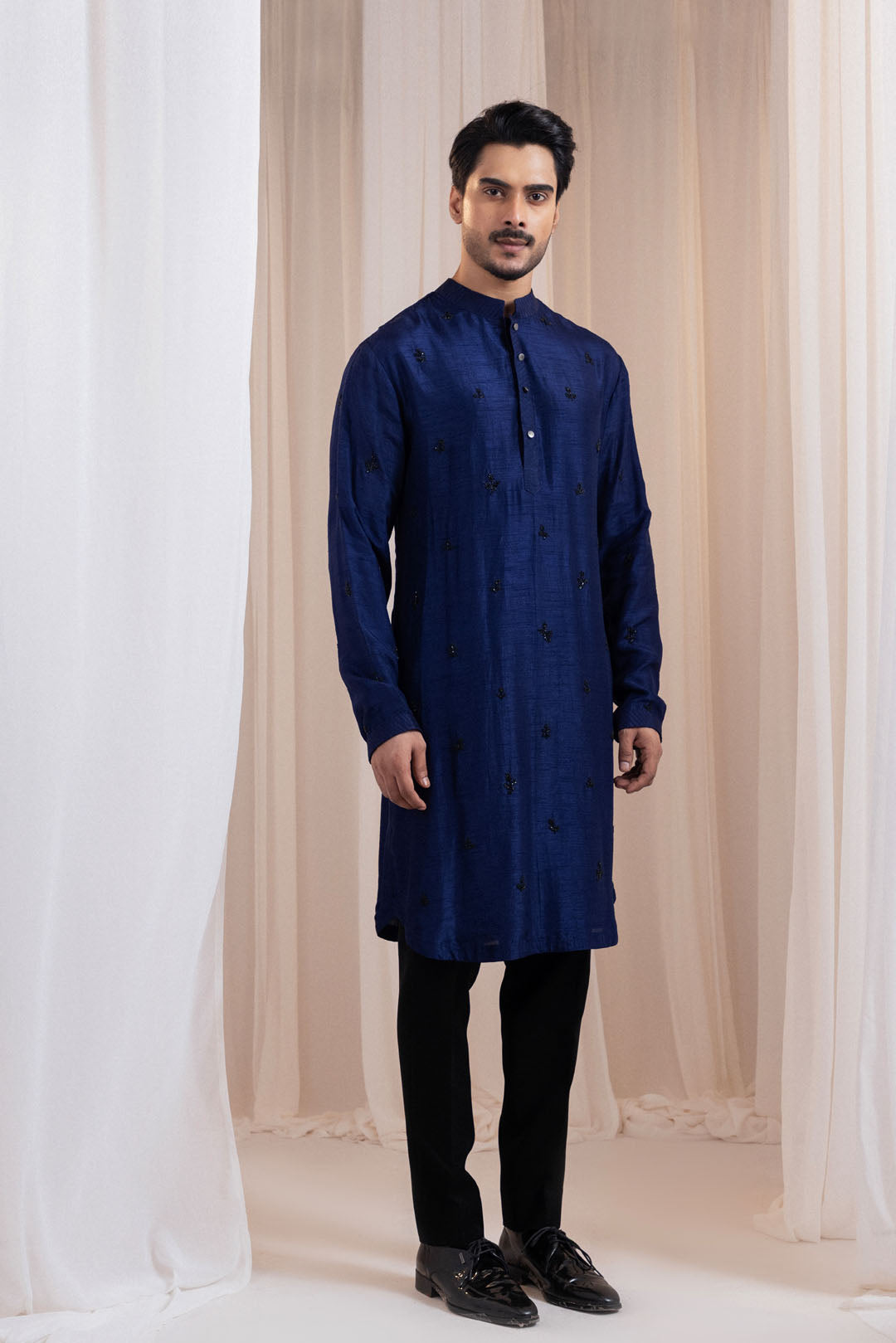 A refined two-piece blue kurta set featuring scattered floral embroidery motifs, delicately embellished with beads and fine threadwork on the collar and sleeve hems. The design evokes a starlit sky—subtle, elegant, and quietly radiant. Perfect for semi-formal occasions where understated sophistication is key.