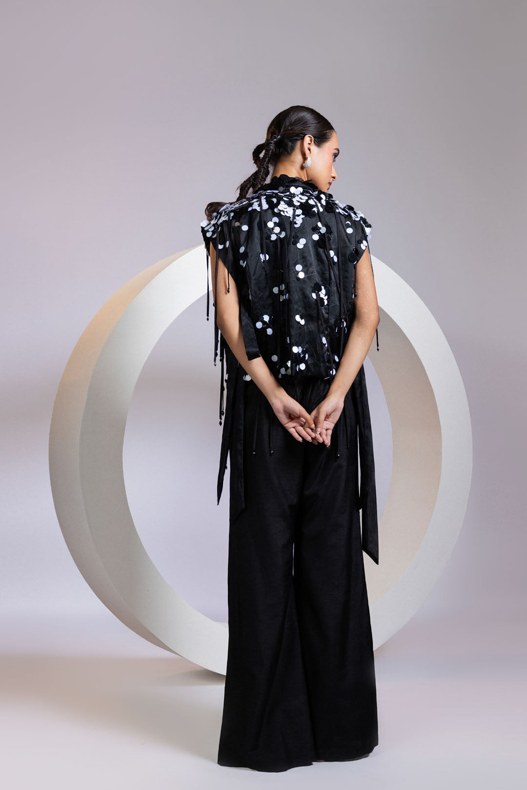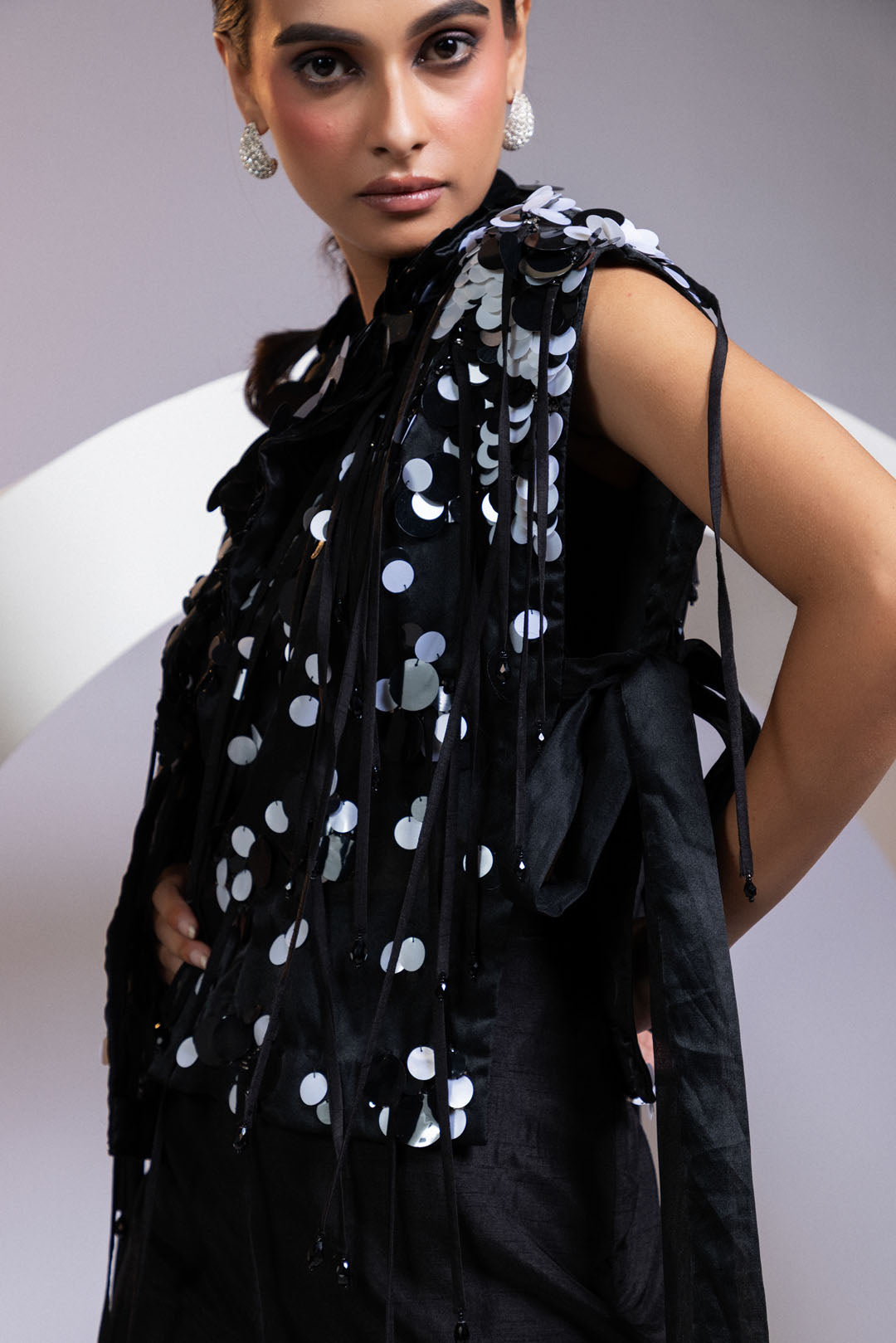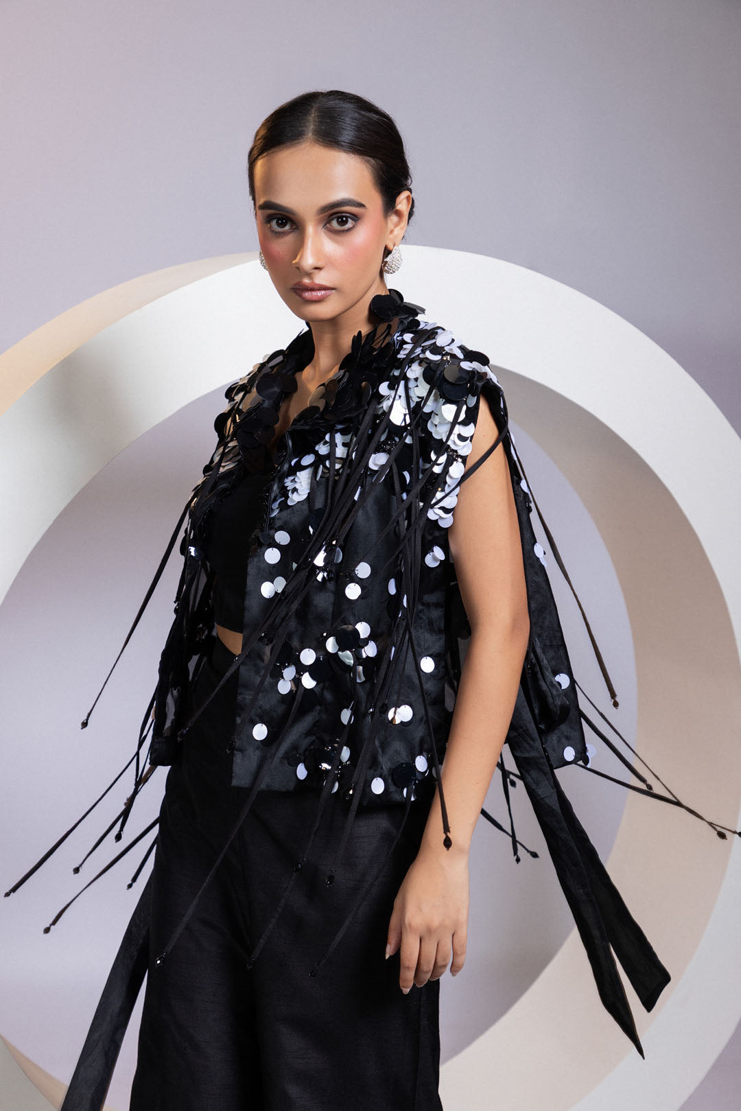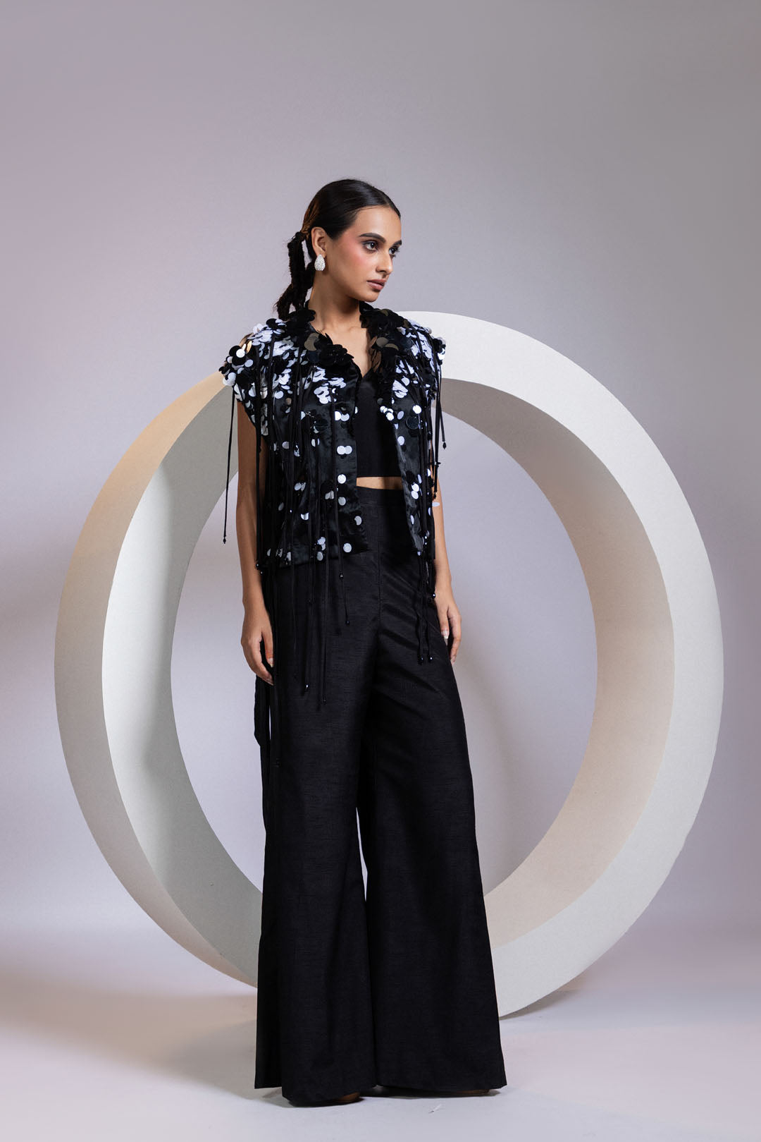 A striking three-piece ensemble featuring a boxy cropped jacket embellished with black and white sequins, cutdana, crystals, and cascading fringe hangings. Paired with a clean, structured top and straight pants to offset the jacket’s bold shimmer. The look channels the energy of a comet streak—bold, luminous, and unforgettable. Perfect for cocktails and statement festive soirées.