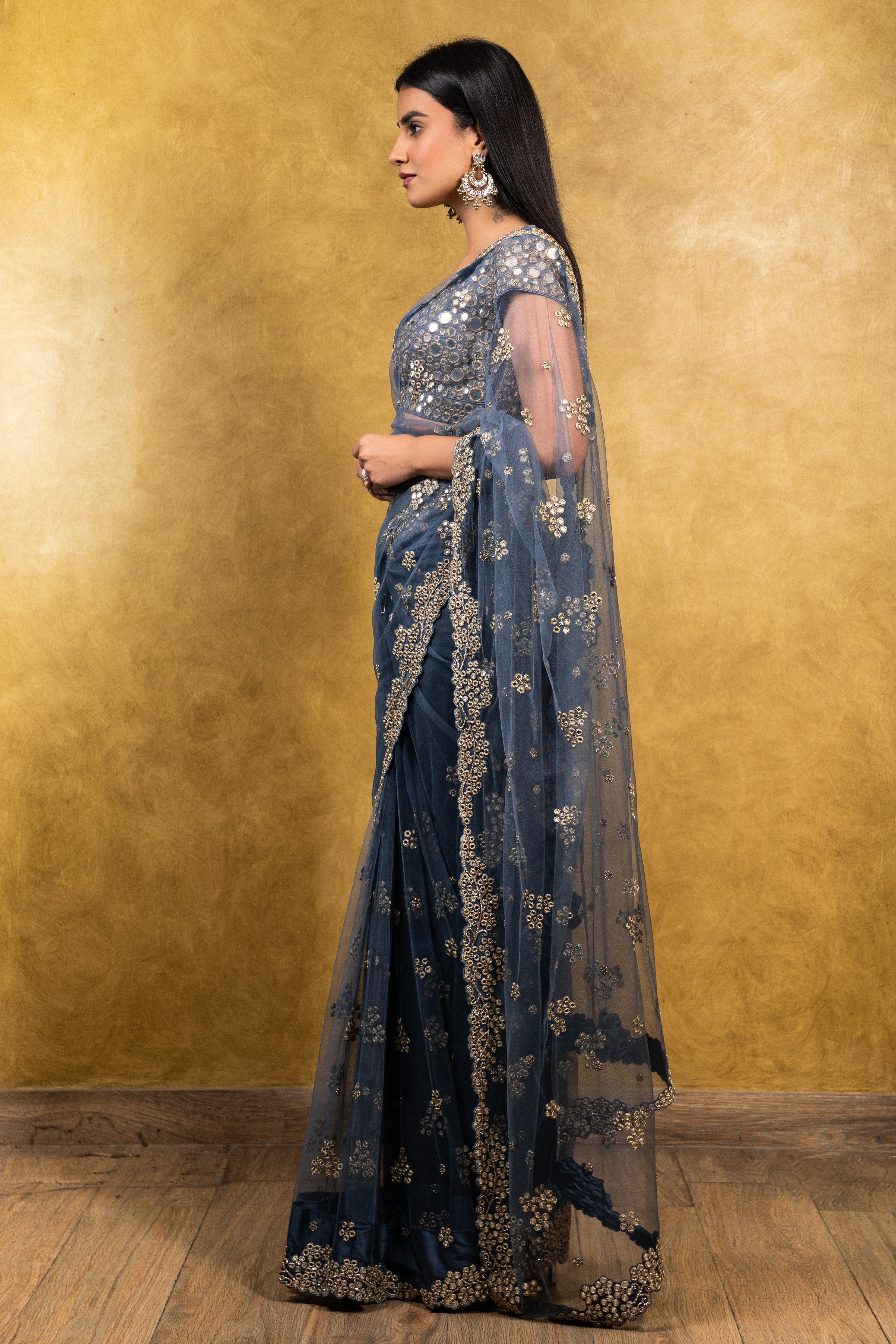 Stone blue tulle saree with taffeta blouse & embellished with mirrors & patra.