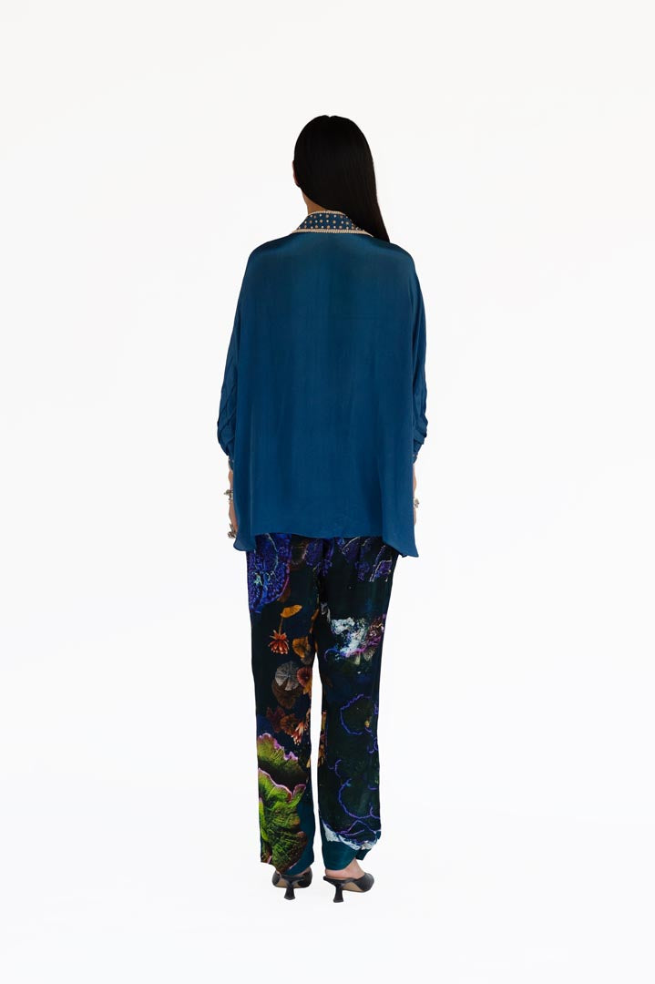 Sudoku co ord comes with finely carved hand embroidery paired up with ''not so formal'' pants, it is a easy silk silhouette that is must have for an ideal setting of fort evenings, a fancy vacation or brunch out of the city, one of the hassle free outfit that provides you with all-day comfort while making you look chic !