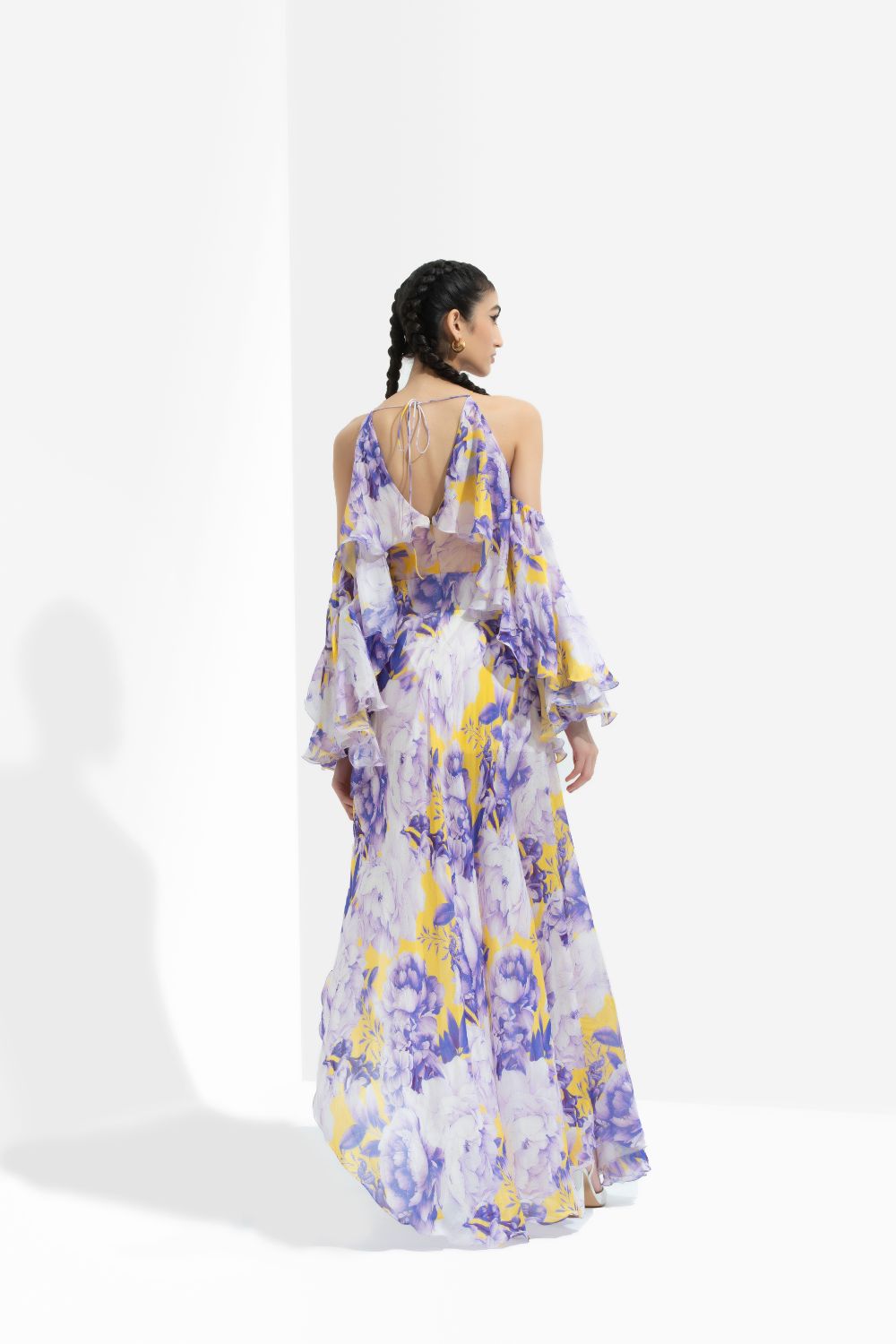 Sumire printed chiffon butterfly dress with high low hem and side slit.
