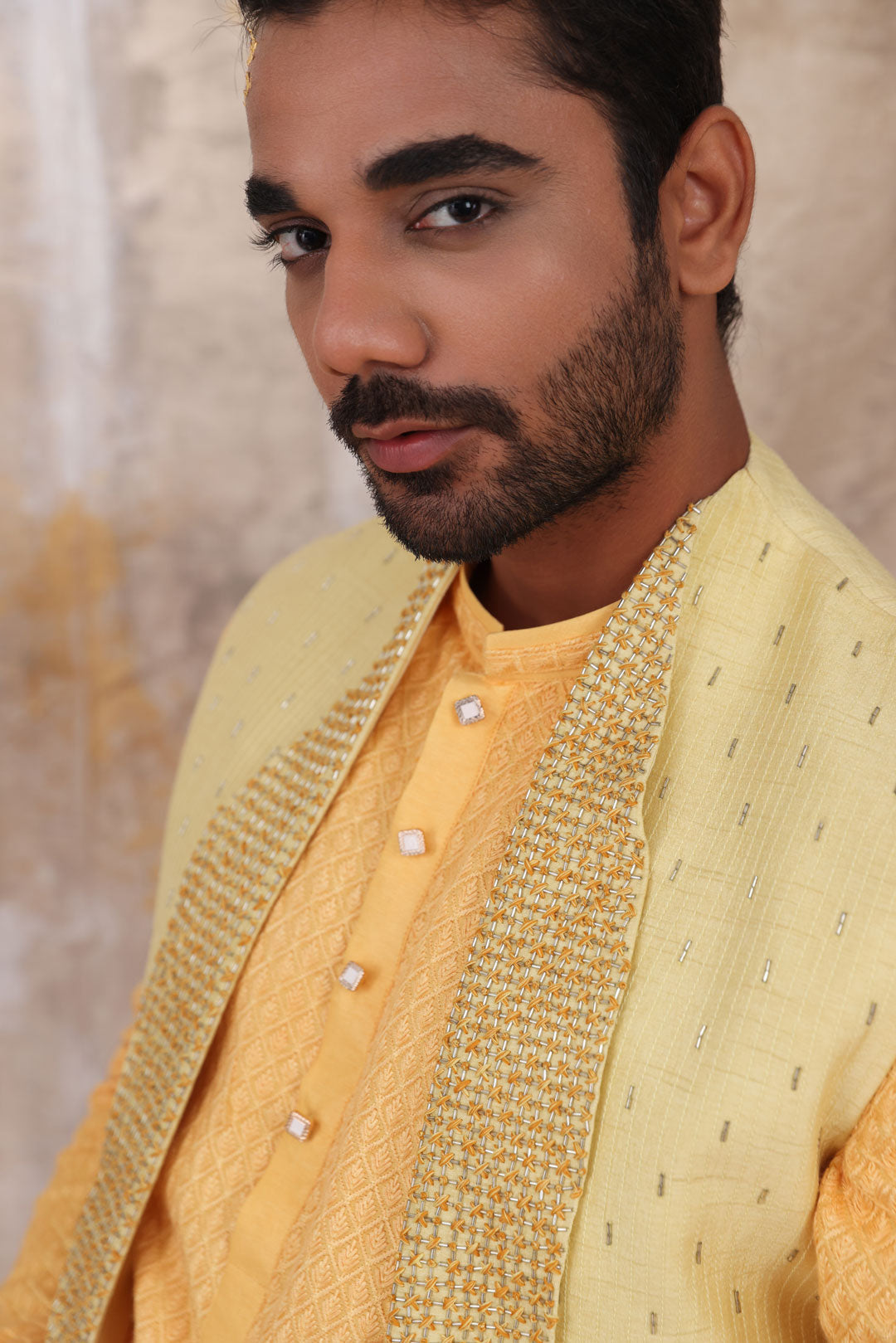 Sport the ethnic look this wedding season, with this exquisitely crafted threadwork kurta featuring a crisscross pattern. The shawl collar nehru jacket in corn yellow features pipe sequin embellishments spaced all over the front panels and presents heavily on the collar. Pin tucks wrap at the hips, surrounding the back. Nehru Length is 32". Kurta Length is 34". **The color may slightly vary due to screen lighting.