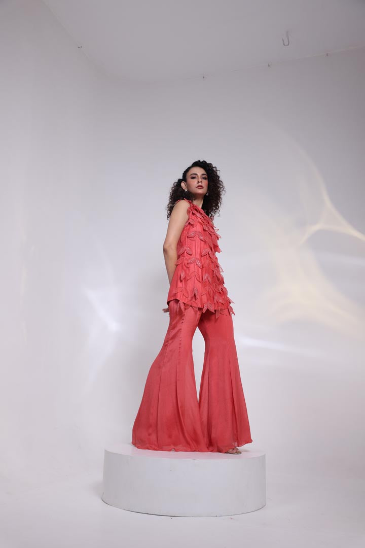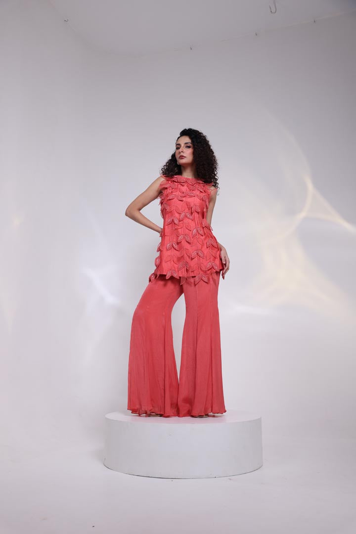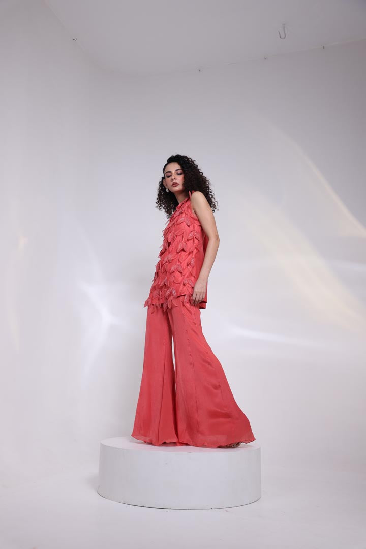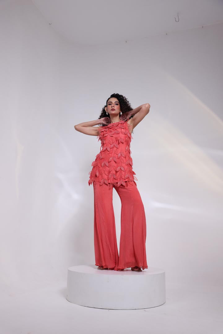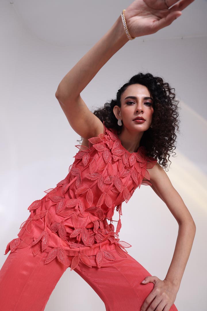 TWO PIECE CO-ORD SET IN A BURNT TERRACOTTA TONE FEATURING A STRAIGHT CUT TOP WITH ALL OVER 3D LEAF APPLIQUÉ AND EMBELLISHED DETAILING. PAIRED WITH MATCHING WIDE LEG TROUSERS FOR A MODERN SILHOUETTE. AN ELEGANT CHOICE FOR FESTIVE EVENINGS, ART EVENTS AND CONTEMPORARY CELEBRATIONS.