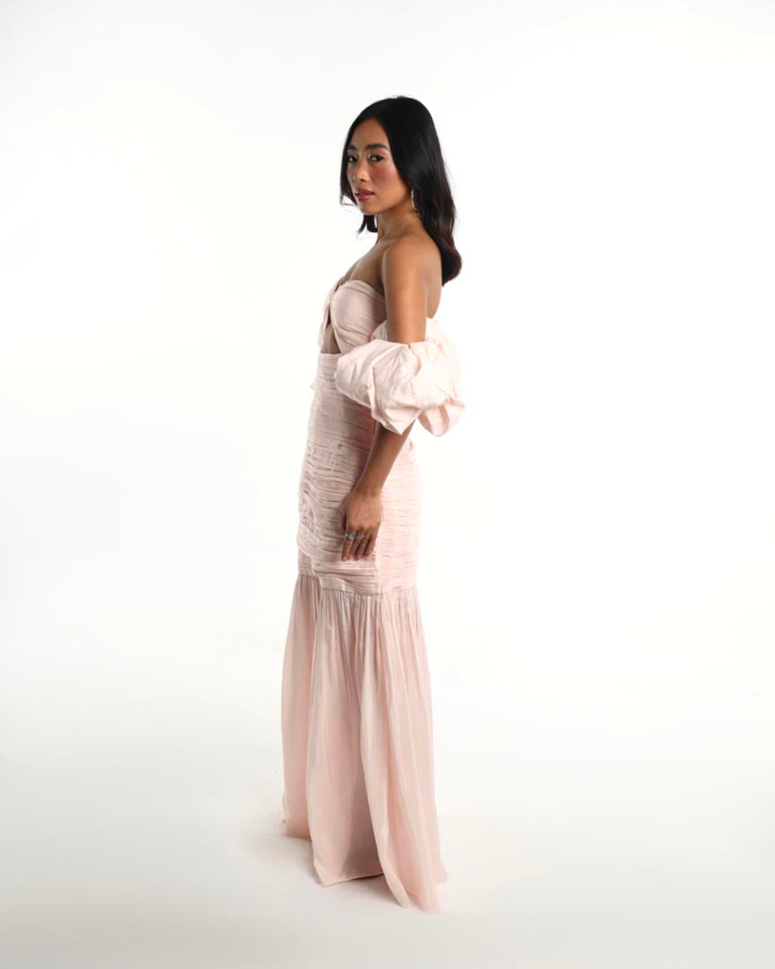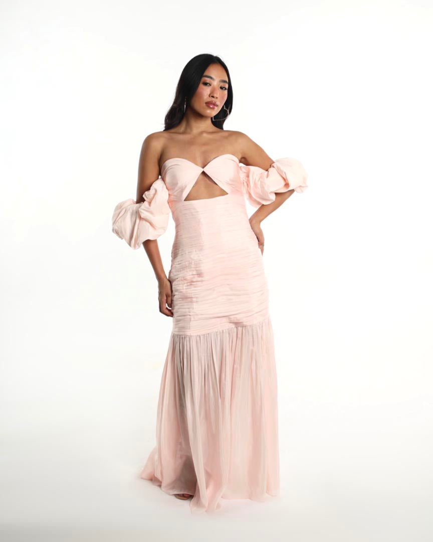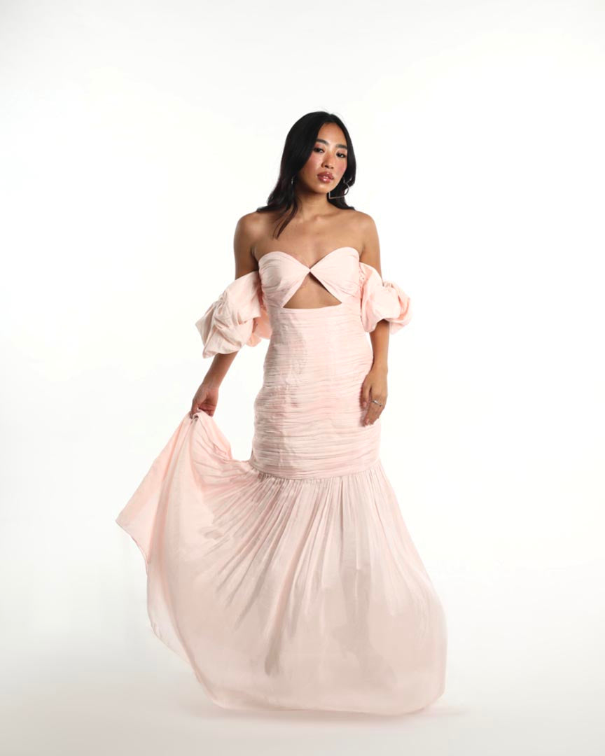 The THALINA dress blends fluid femininity with bold structure. Crafted in a delicate blush hue, it features voluminous off-shoulder puff sleeves, a sculpted bust with a front cut-out, and a bodice that flows into a breezy gathered skirt. Light as air, yet striking in silhouette, perfect for summer, baby showers, or sundown celebrations.