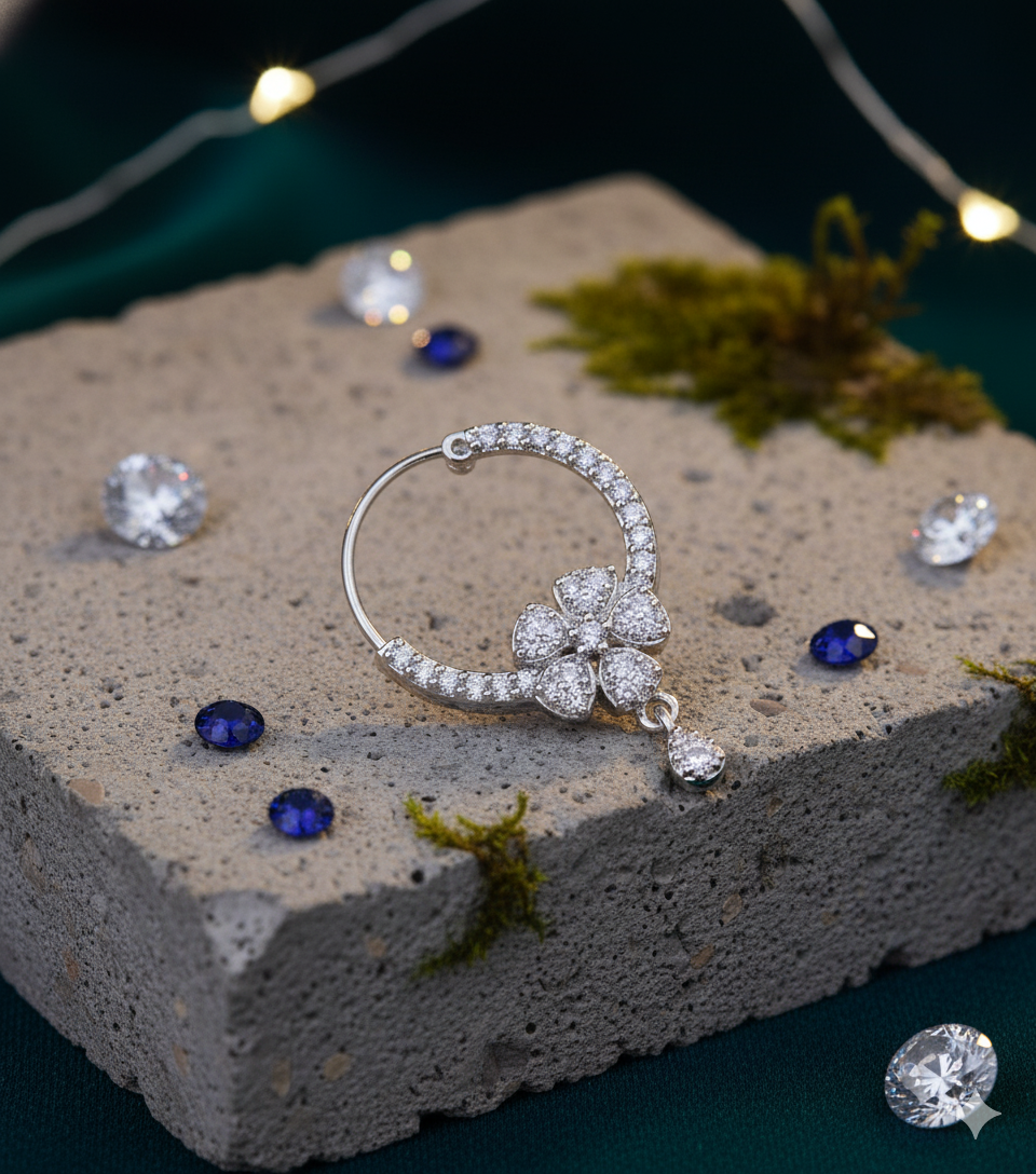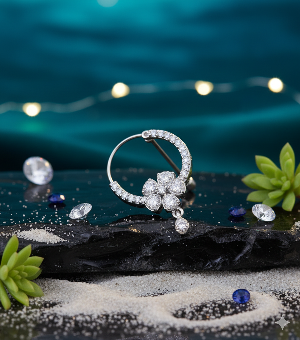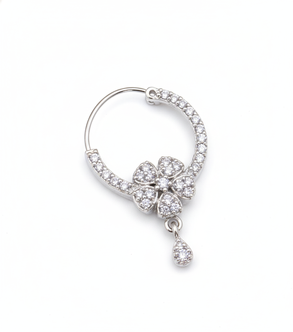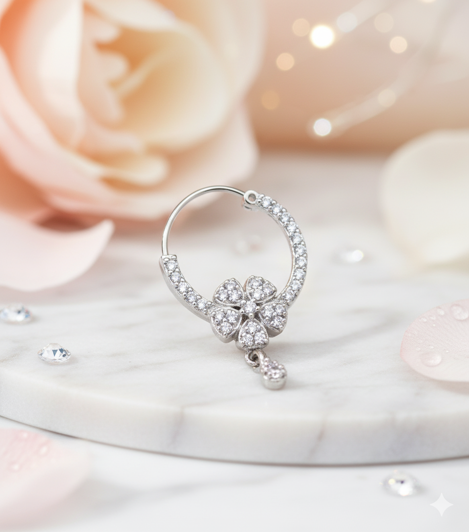 Dazzling Design: Featuring a gracefully curved hoop, meticulously encrusted with brilliant round-cut Cubic Zirconia stones, this nath leads to a beautifully crafted central five-petal flower. Each petal is adorned with individual sparkling stones, creating a captivating bloom effect.