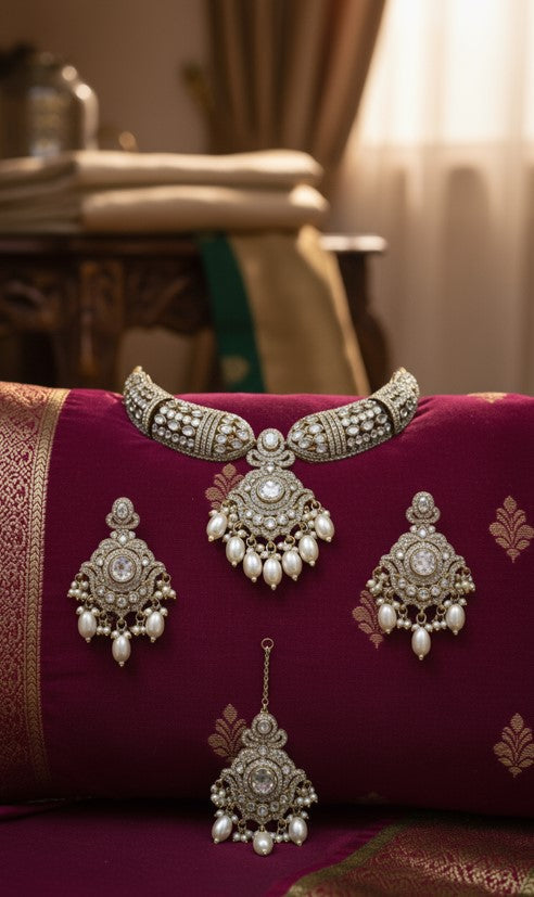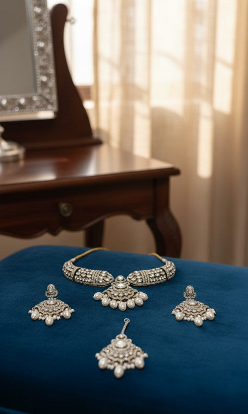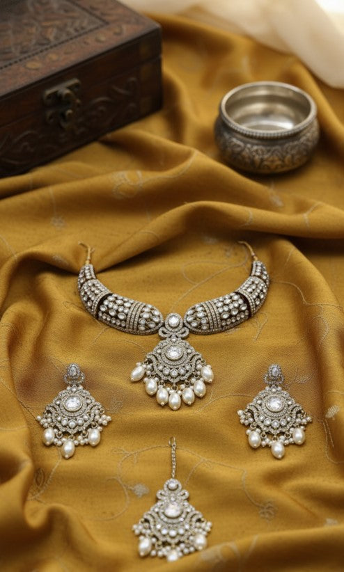 The majestic collar necklace sweeps across the neckline in a regal crescent, while the perfectly matched earrings and maang tikka echo its intricate, diamond-studded motif. Every facet of this four-piece setcast in a rich silver-tone alloyis polished to perfection, making it the ultimate statement of luxury for any momentous occasion.