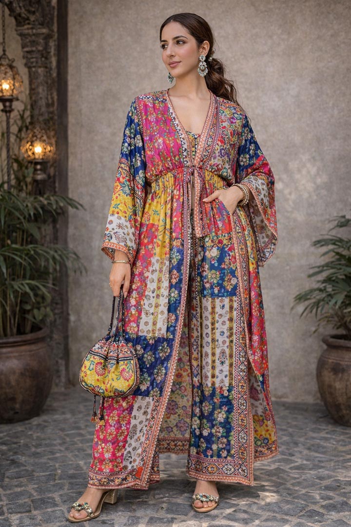 Crafted in fluid crepe fabric, this three-piece ensemble features a digitally printed shrug layered over matching printed pants, designed for effortless movement and comfort. Delicate hand-glued mirror accents are scattered across the fabric, adding soft sparkle that catches the light without overpowering the vibrant artwork.