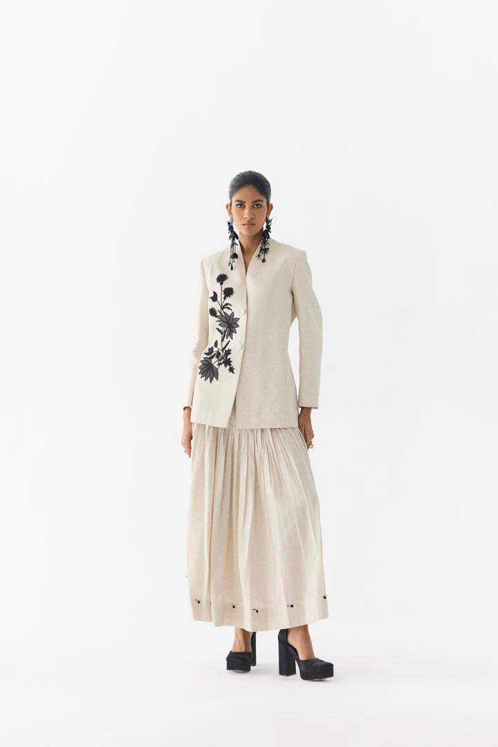 The Tiger Lily Linen Blazer & skirt crafted from our stunning viscose linen fabrication, trans-seasonal, is a statement piece. This blazer, made in our linen, has a fitted look. With a v-neckline, the blazer is hand embroidered with organza and bead flowers. It has pockets and is lined. It is paired with our matching tiger Lily Linen Skirt with a side zipper. Wear it with heels for an elegant look.