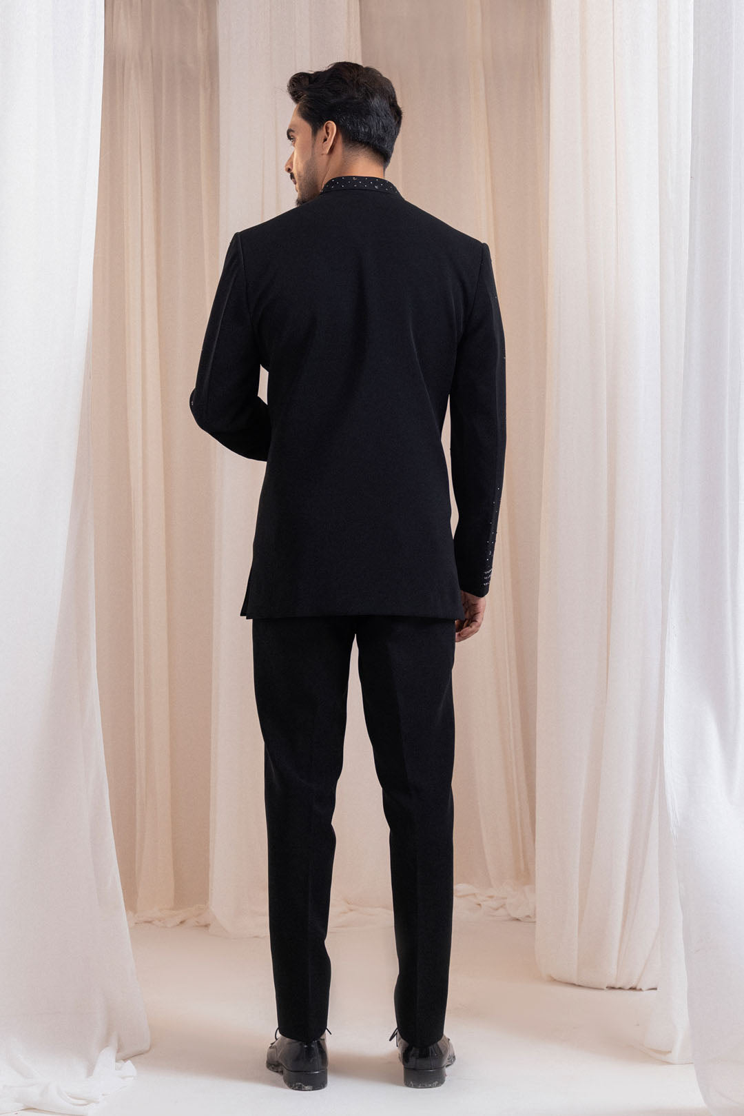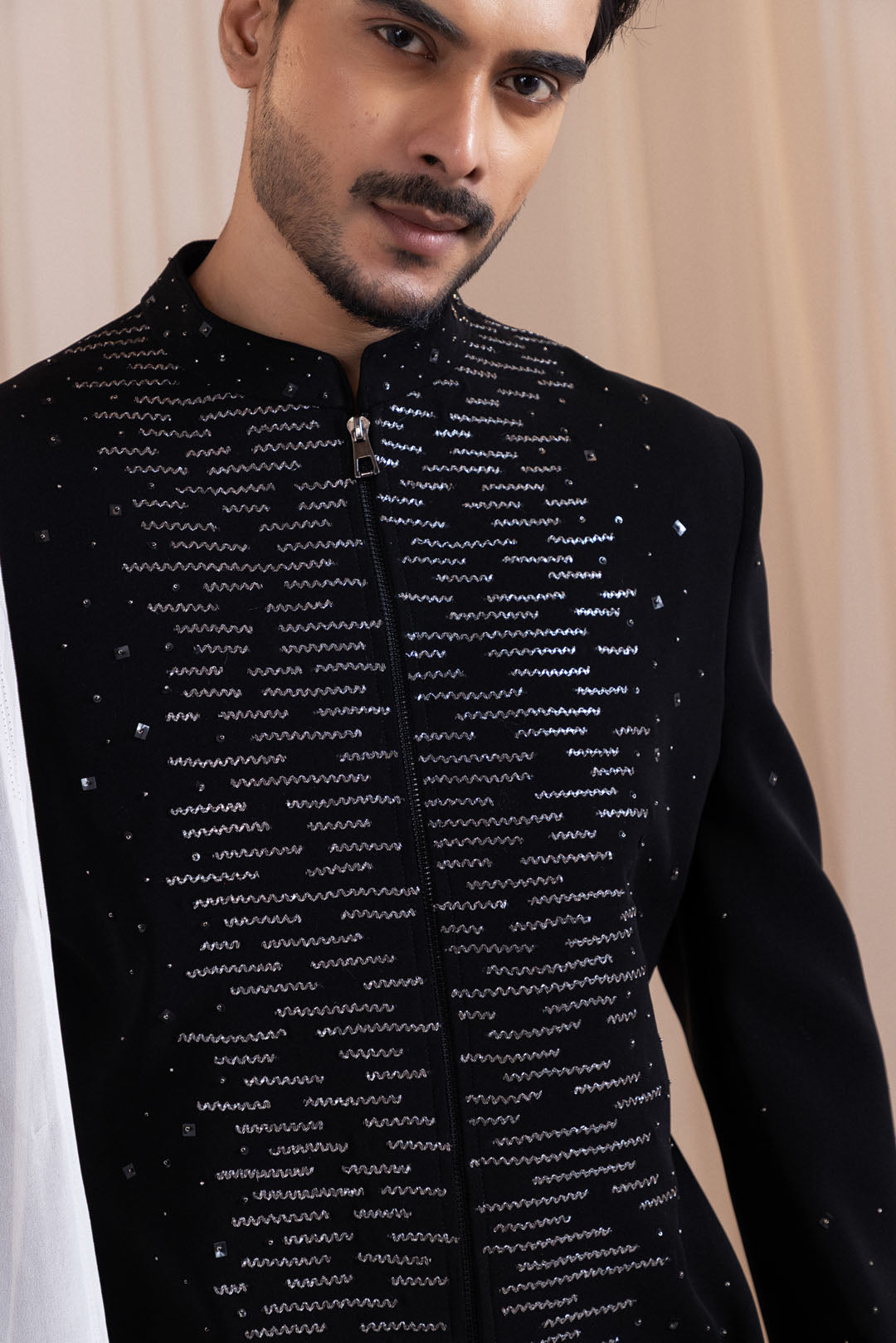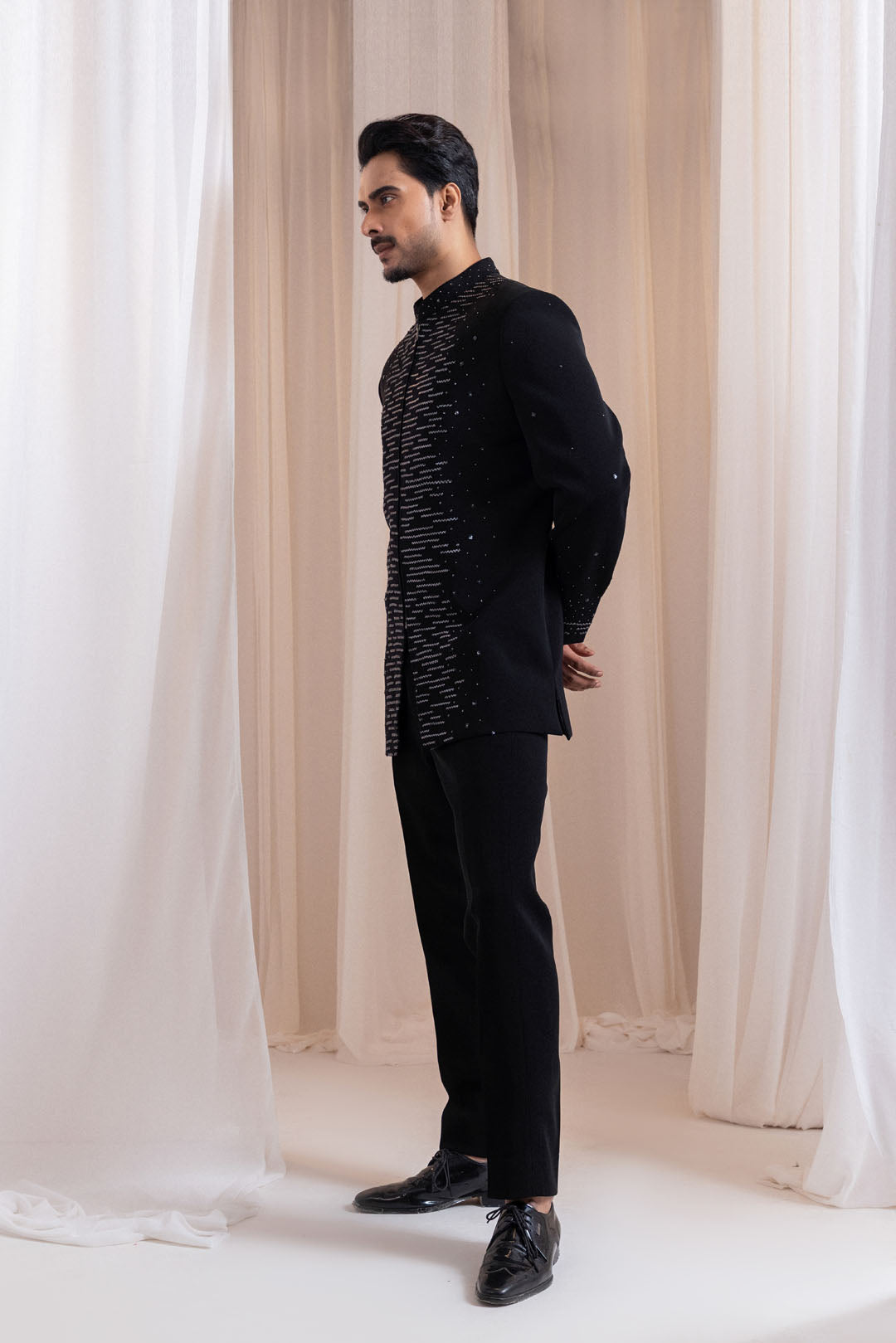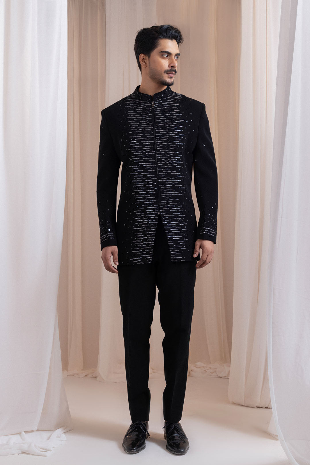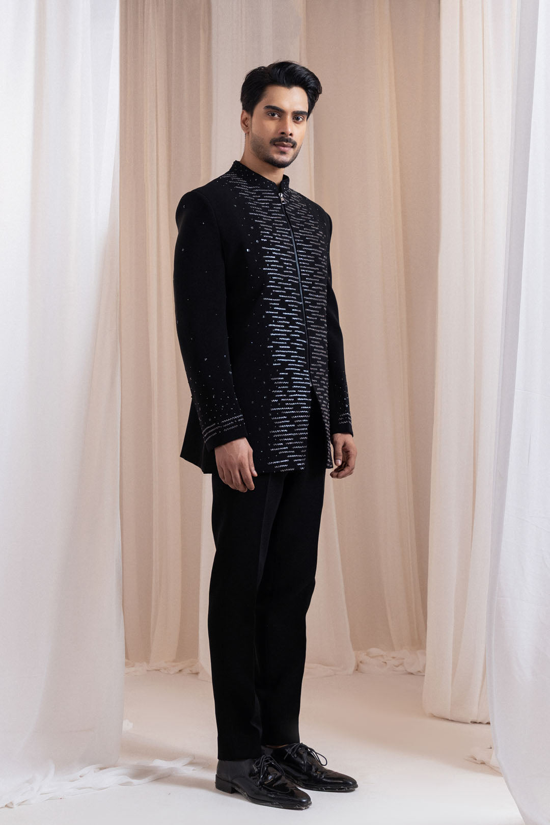 A sleek two-piece bandhgala and trouser set featuring silver thread embroidery in horizontal zigzag lines, creating a rich, tactile surface. Scattered sequins and beadwork across the front and sleeves add refined shimmer and dimension. Tailored for formal evenings and festive gatherings, this ensemble brings together structure, subtle shine, and understated elegance.