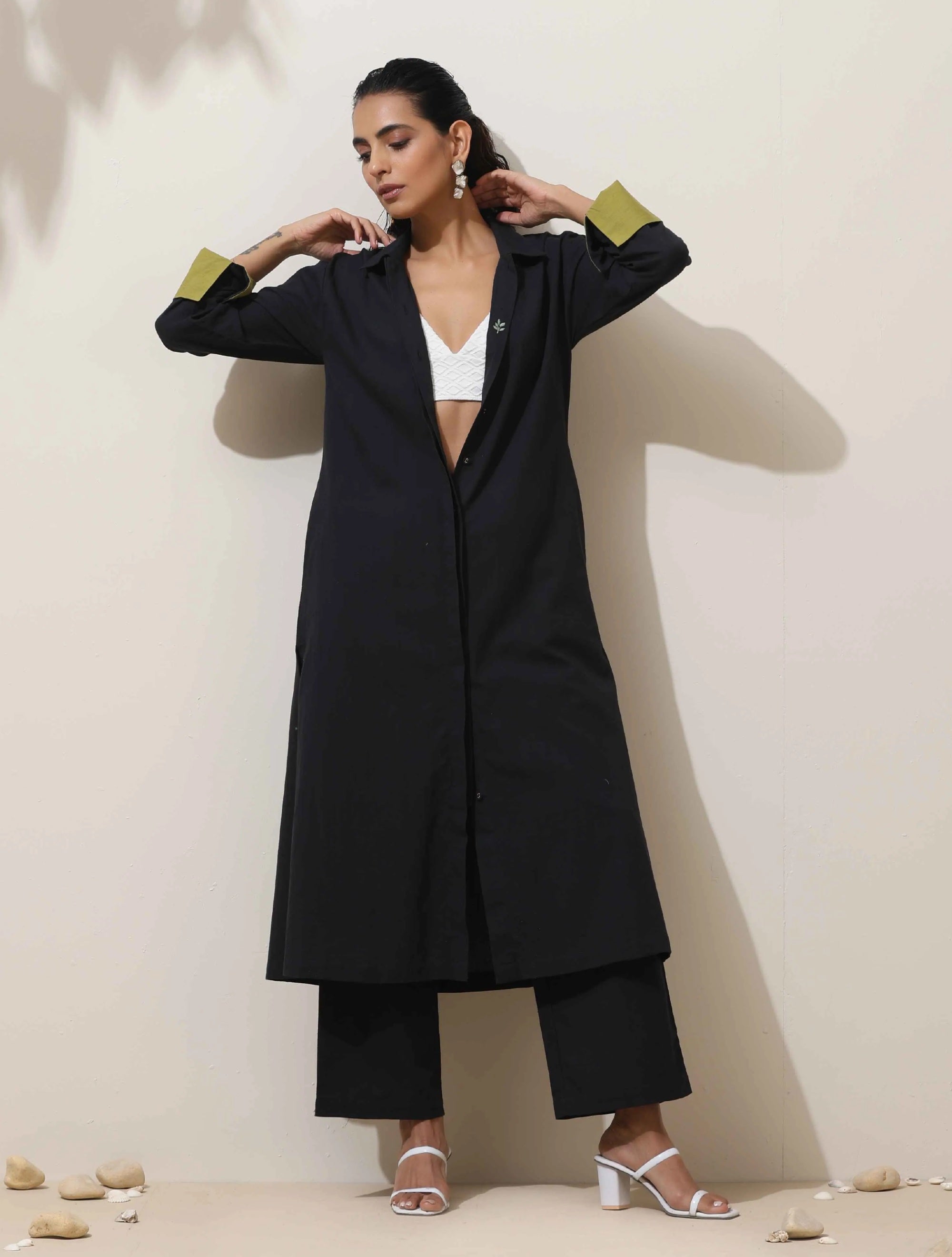 - Elevate your style with this black front-button kurta with pear green trim detail, paired with black pants. It's an ideal blend of elegance and comfort, perfect for both casual and semi-formal occasions.