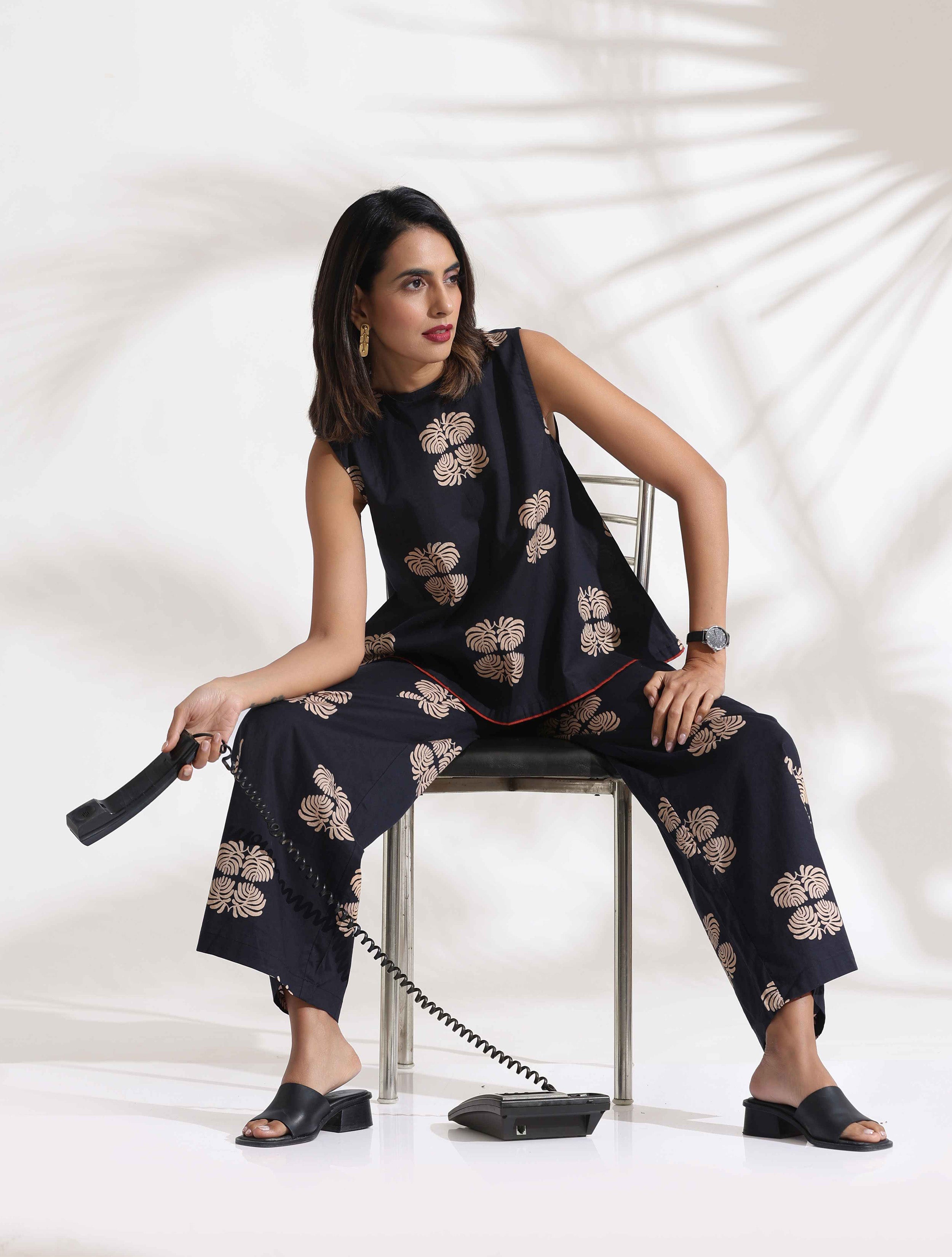 - Step into effortless elegance with this black cotton print top and printed flared pant co-ord set. This ensemble combines modern chic with timeless comfort, making it your perfect go-to for any occasion where you want to make a statement.