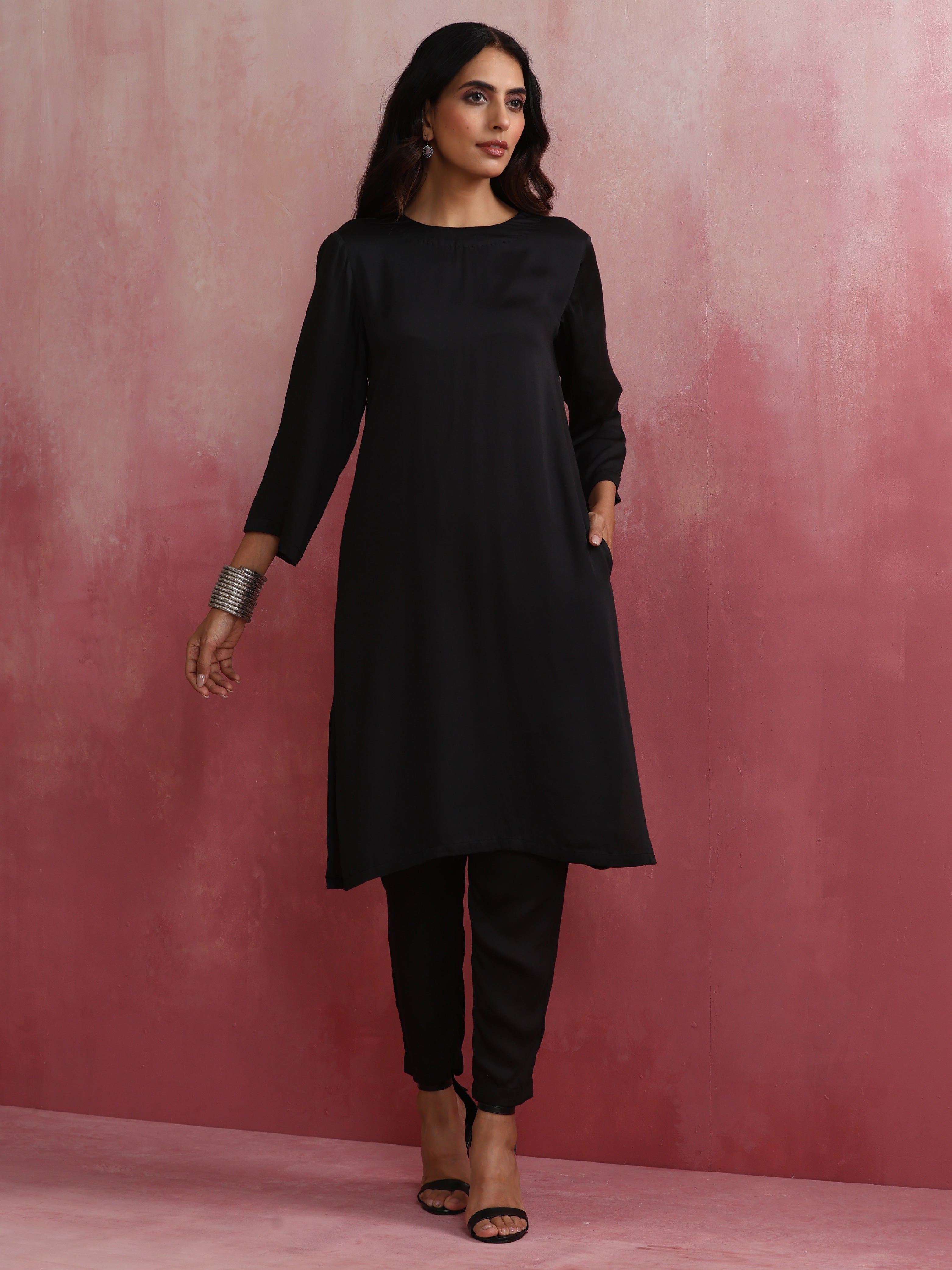 - Elevate your style with this black modal kurta featuring front round and back V neckline with 3/4th sleeves.