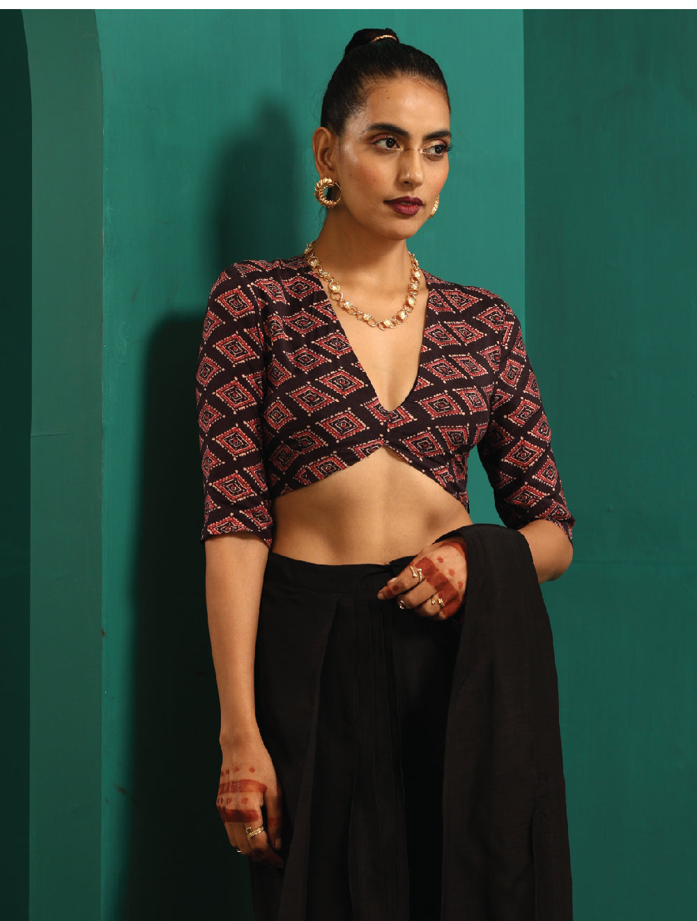 - Muslin silk Printed Top Choli with Deep V- neckline and elbow sleeve.