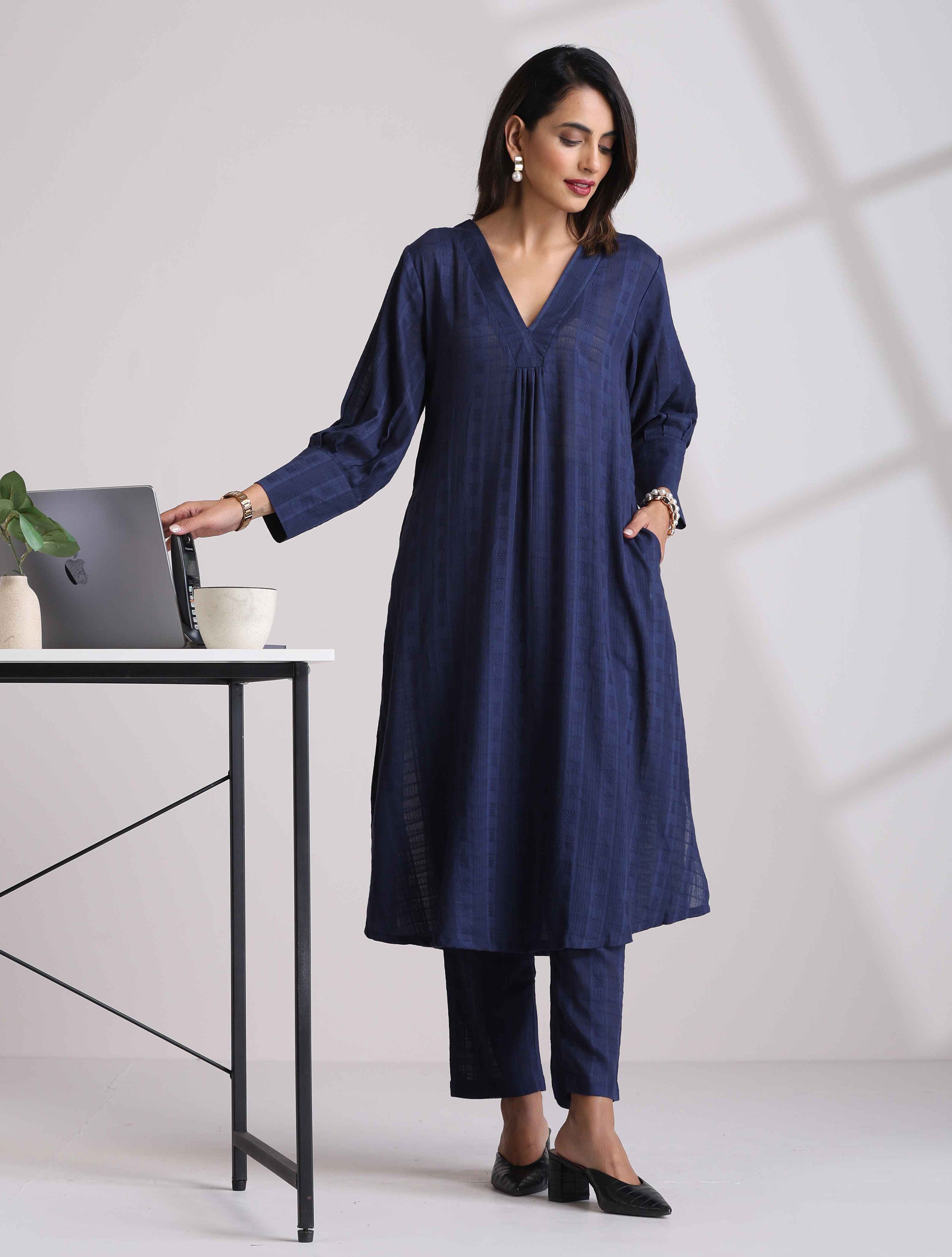 - Cotton Dobby Kurta with V-neckline, neck gathers and puff sleeves with broad cuff. Paired with elasticated waist pant.