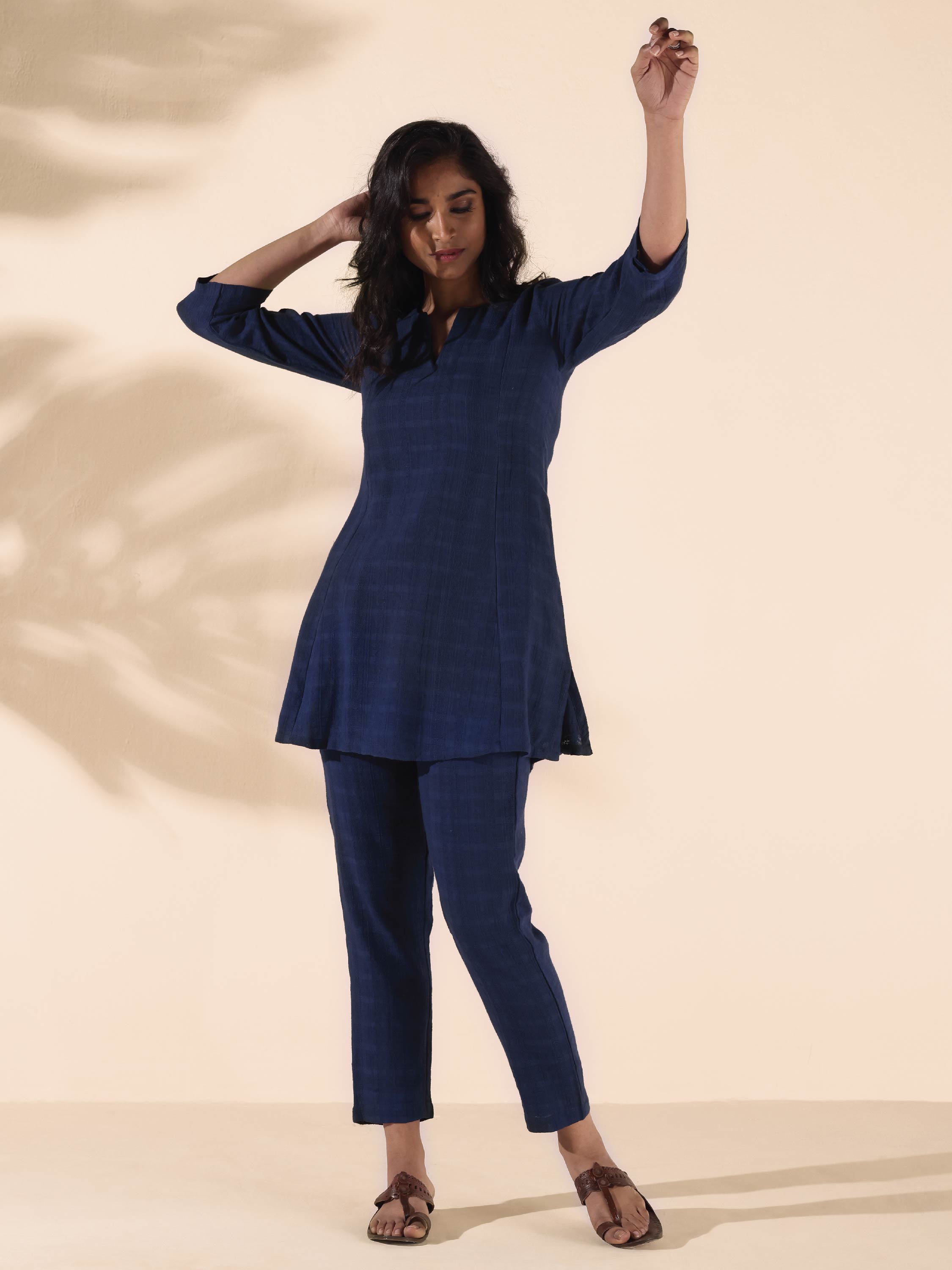- Cotton Dobby Co-ord Set with round neck slit, three-fourth sleeves and slit. Paired with elasticated waist pant.