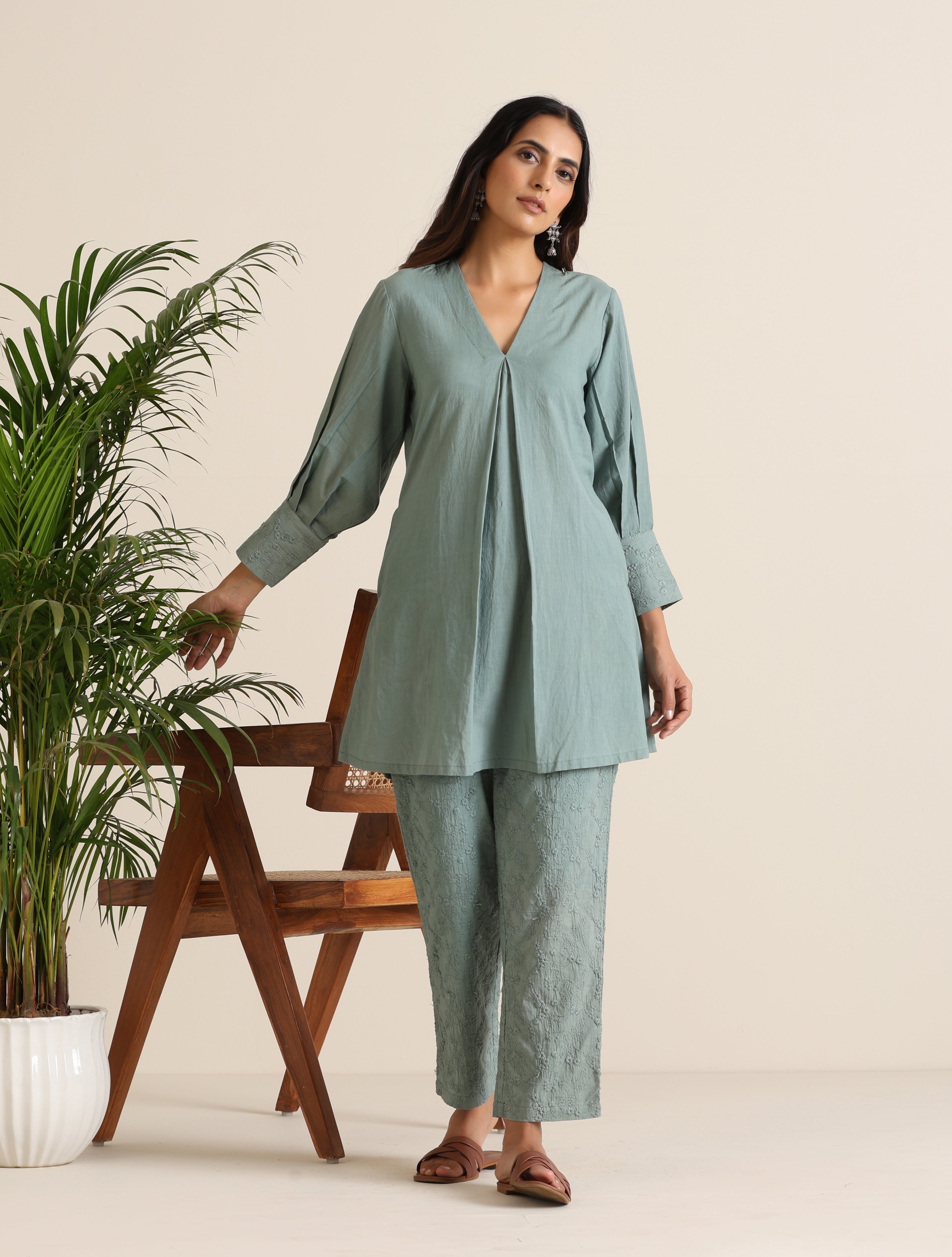 - Cotton co-ord set with front pleat, broad cudd and pleats on sleeve. Paired with Cotton embroidered elasticated waist pant.