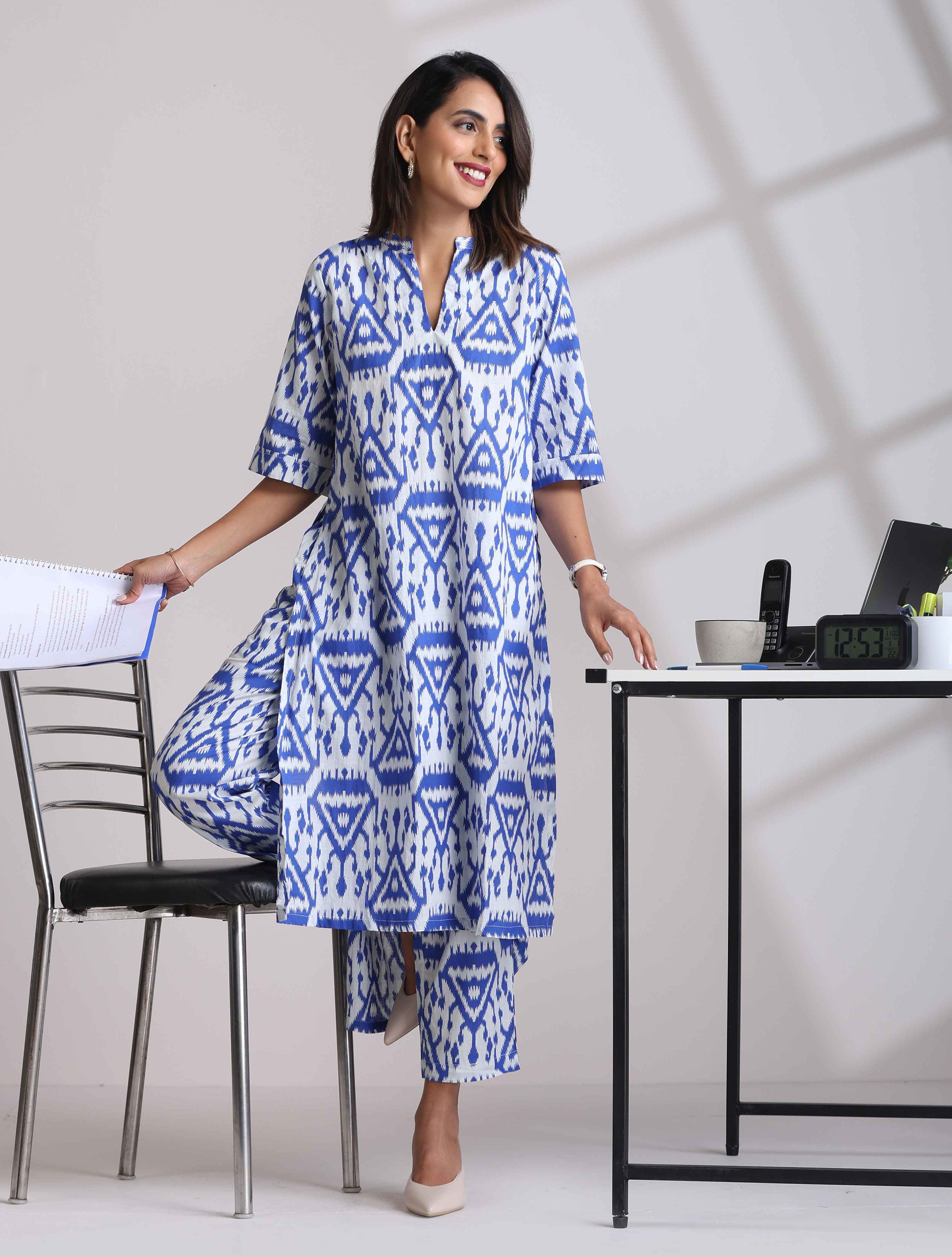 - Cotton Ikat Triangle Printed Kurta with back yoke gathers, high-low hemline, half sleeves and Round neck slit neckline with chinese collar. Paired with elasticated waist pant.