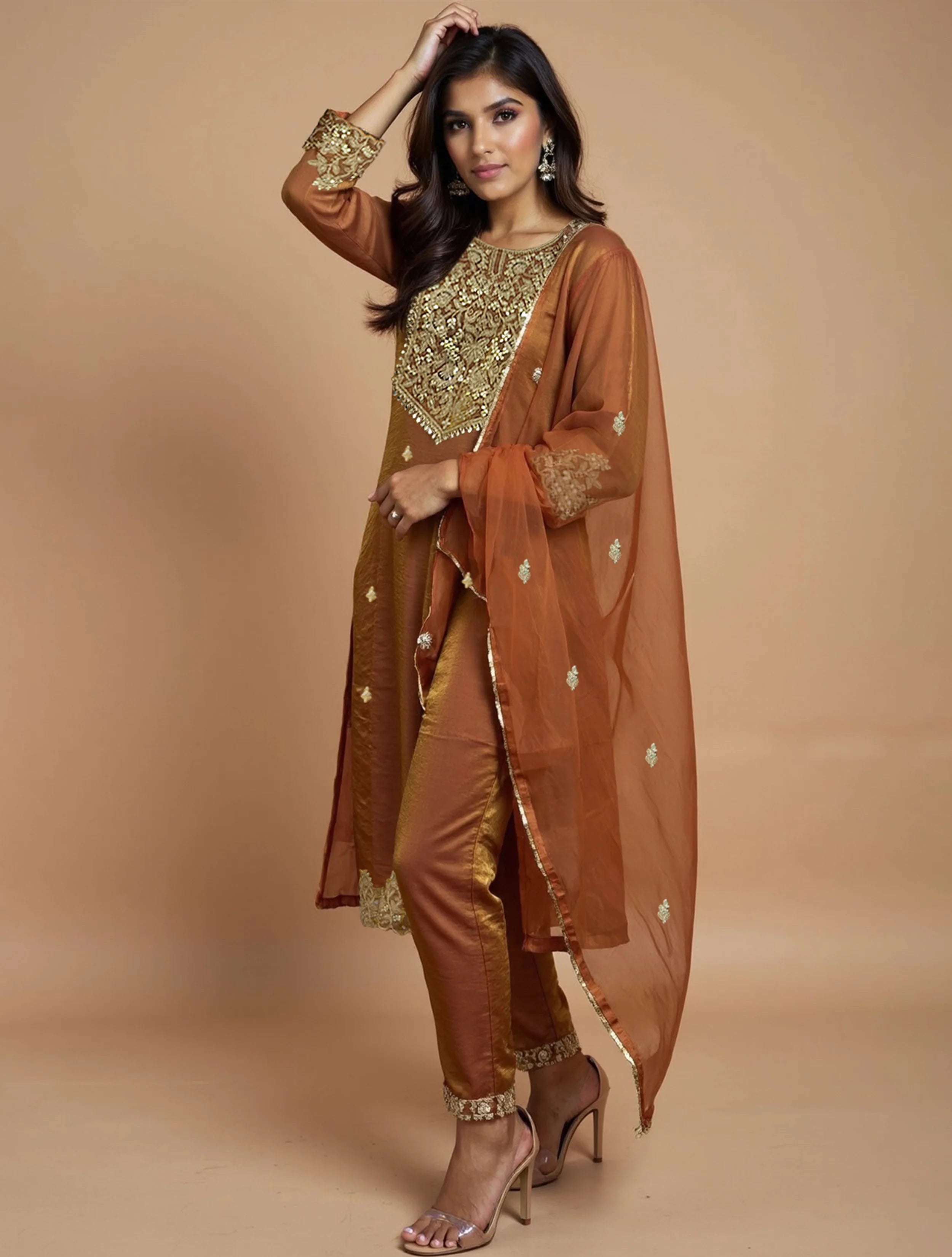 - Elevate your style and step into effortless elegance with this brown tissue embroidery kurta, paired with brown tissue embroidery pant and brown organza dupatta. Designed for modern grace, perfect for festive ease and gatherings.