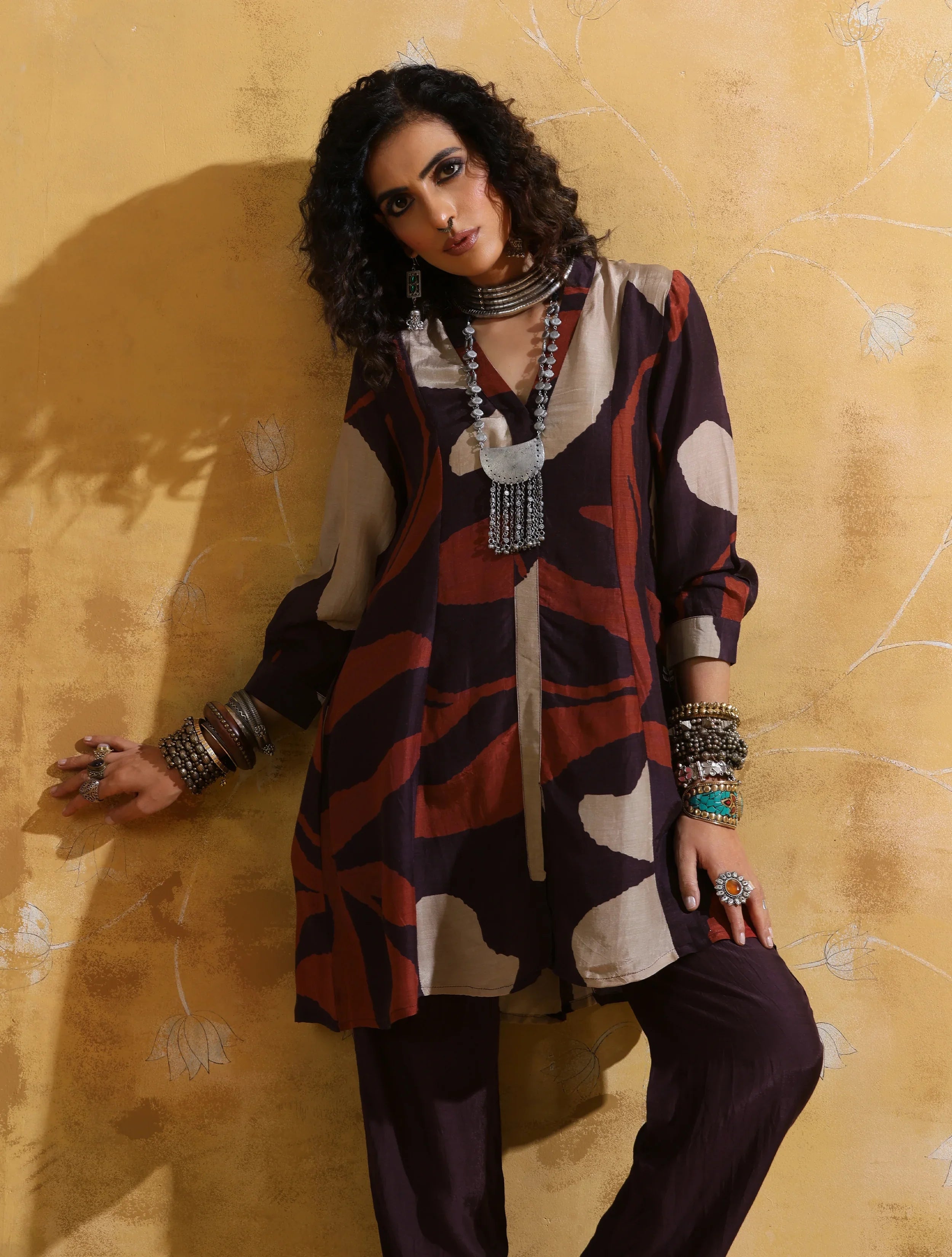- Elevate your style with this cola and rust floral print Kurta paired perfectly with cola pants. Designed for modern style and comfort, it’s perfect for occasions and gatherings.