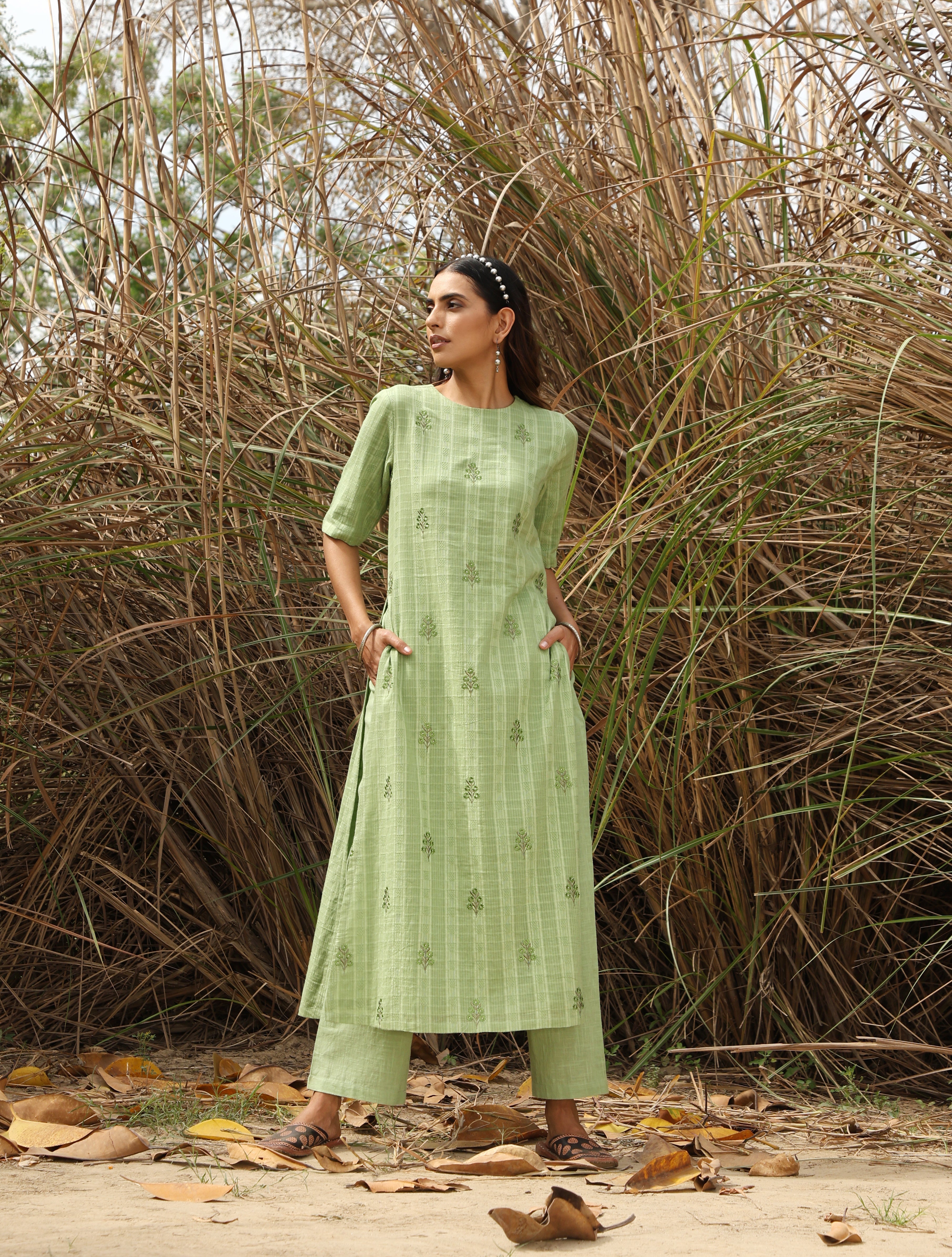 - Cotton Dobby Kurta with round-neckline, high side slits and embroidered front. Paired with solid elasticated waist pant.
