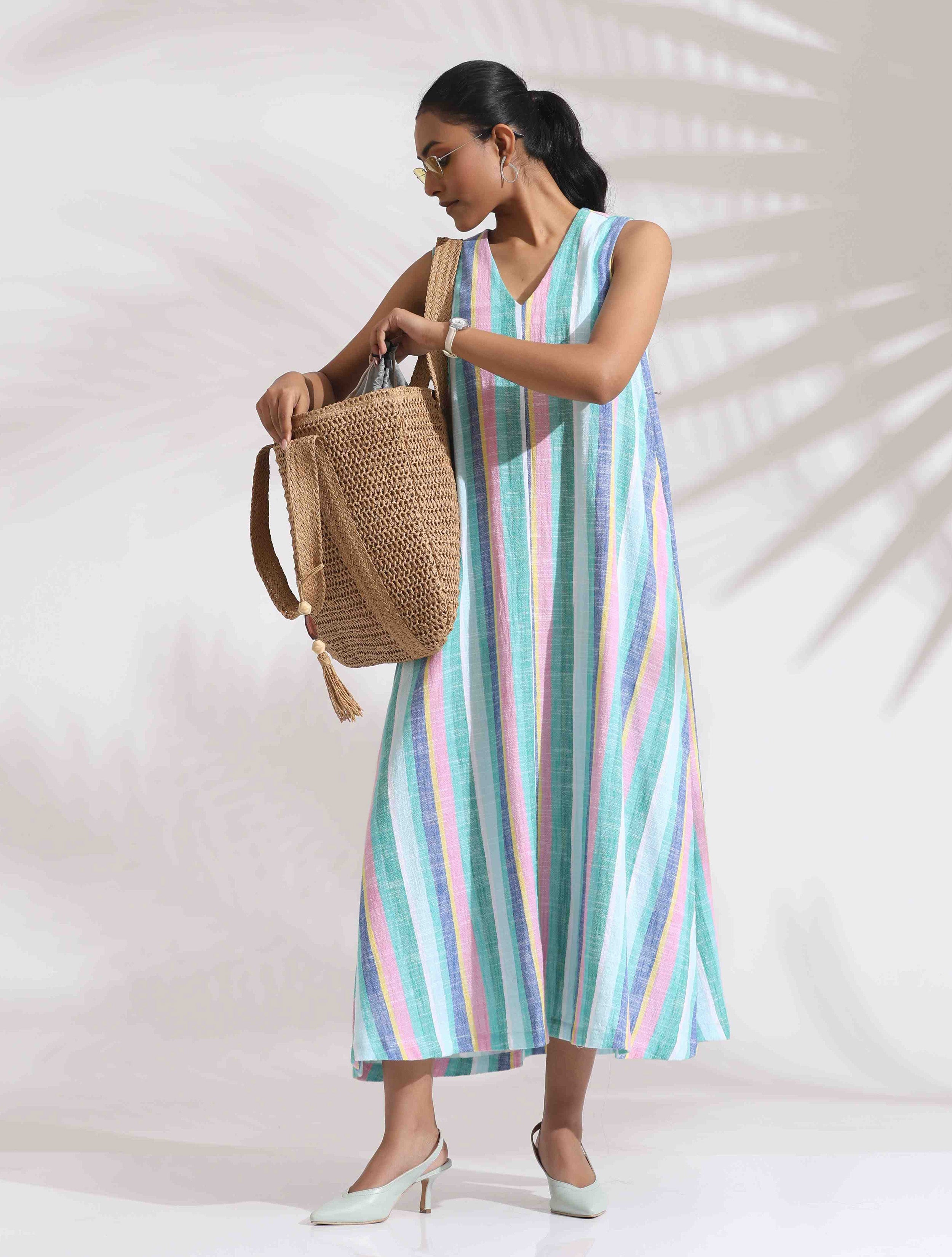 - Elevate your style with this green cotton multi stripe flared dress , it's an ideal blend of elegance and comfort.