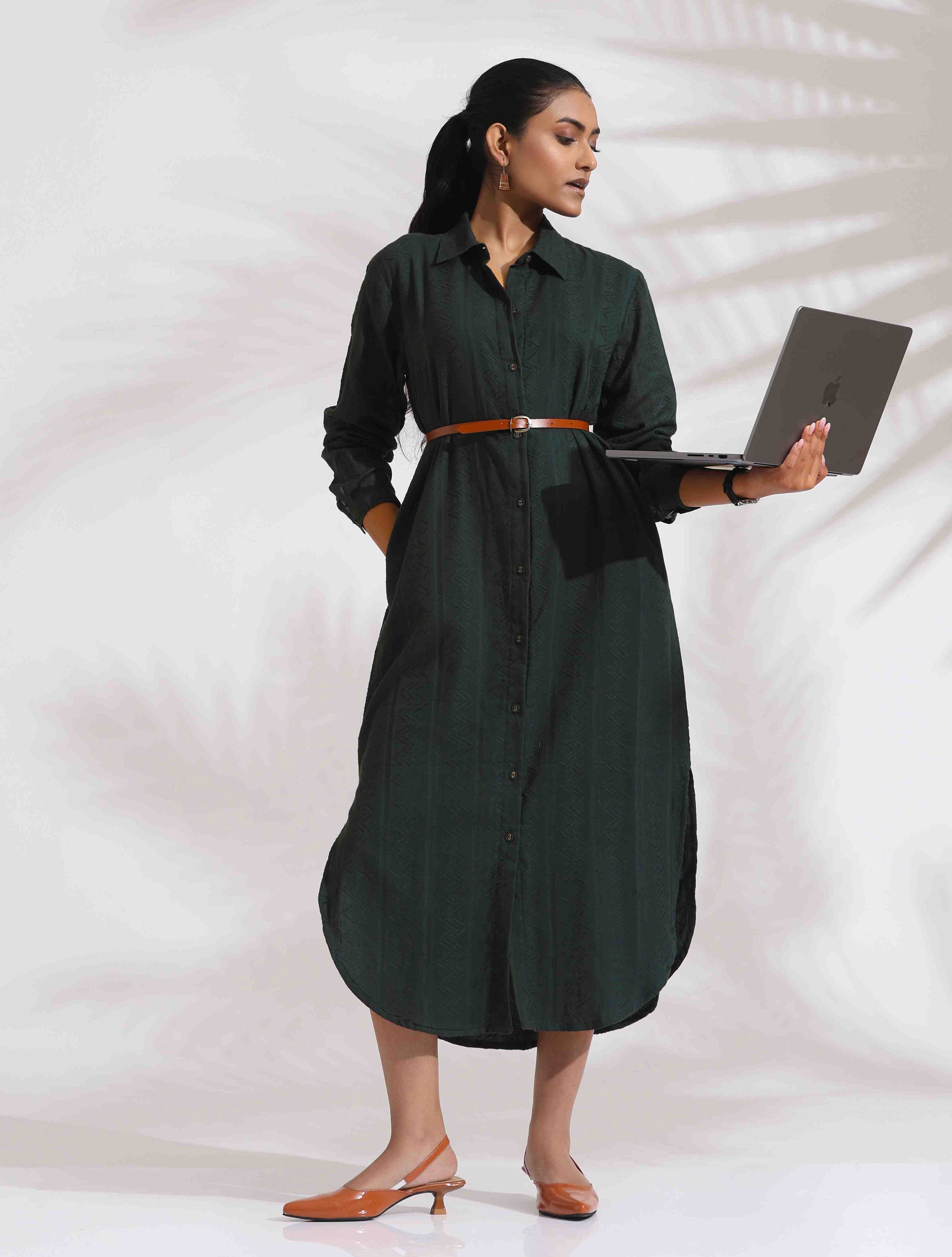 - Elevate your style with this green cotton shirt dress, a perfect blend of elegance and comfort.