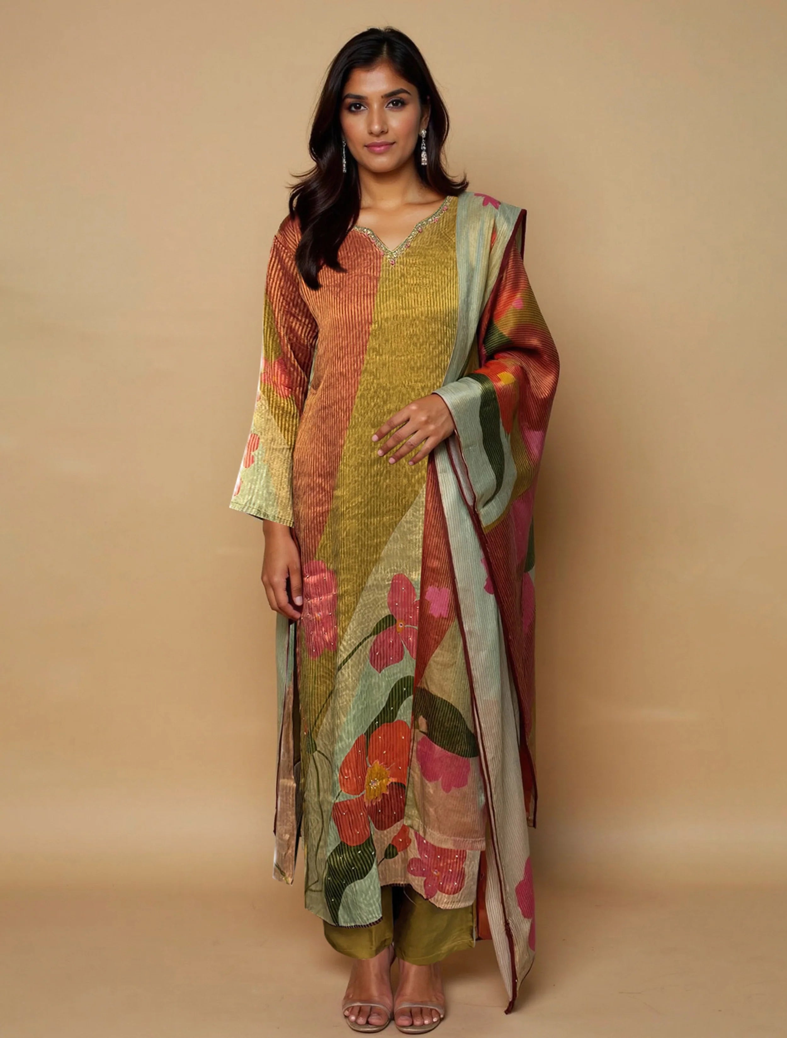 - Elevate your style and step into effortless elegance with this green printed kurta with embroidery details, paired with green pant and green printed dupatta. Designed for modern grace, perfect for festive ease and gatherings.