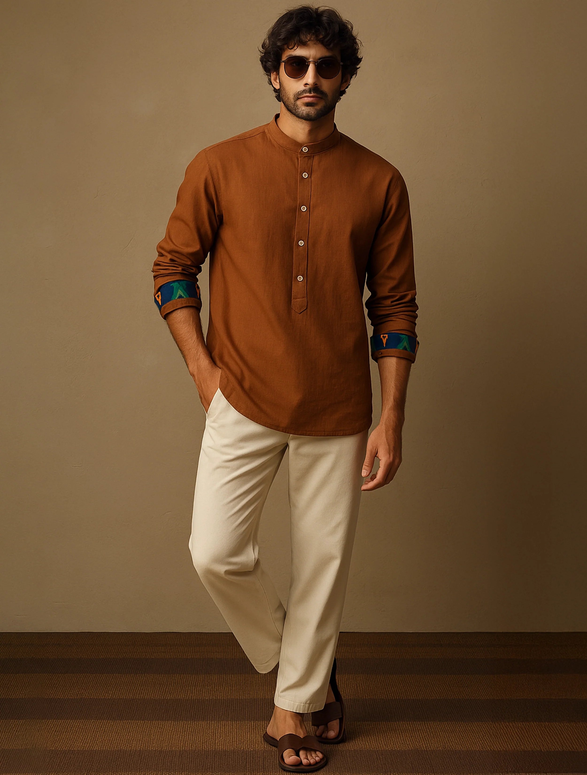 Upgrade your festive wardrobe with this elegant brown cotton shirt, featuring a classic mandarin collar, mid thigh length and full sleeves.