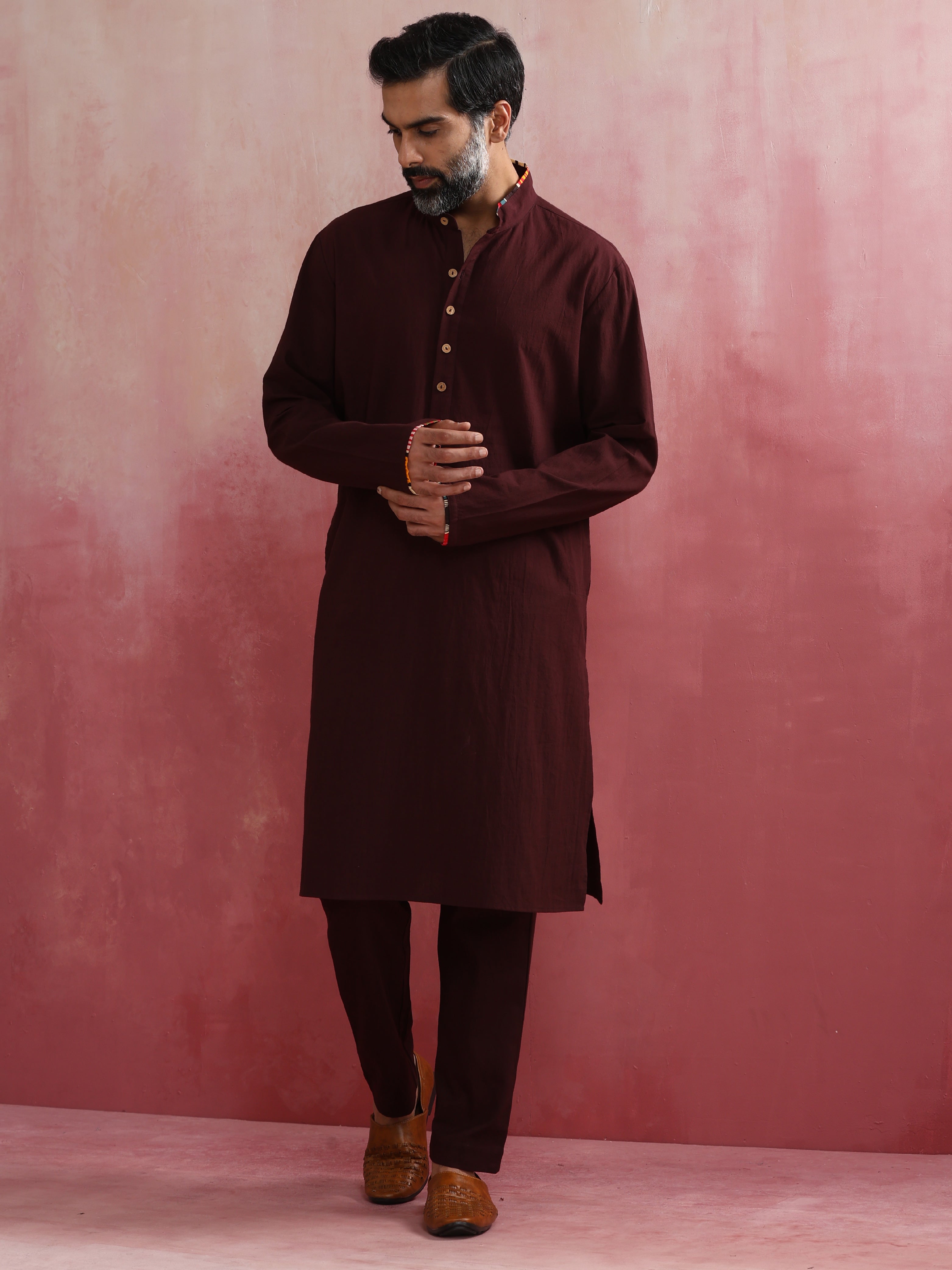 Upgrade your festive wardrobe with this elegant cola cotton kurta, featuring a classic mandarin collar, knee length and full sleeves.