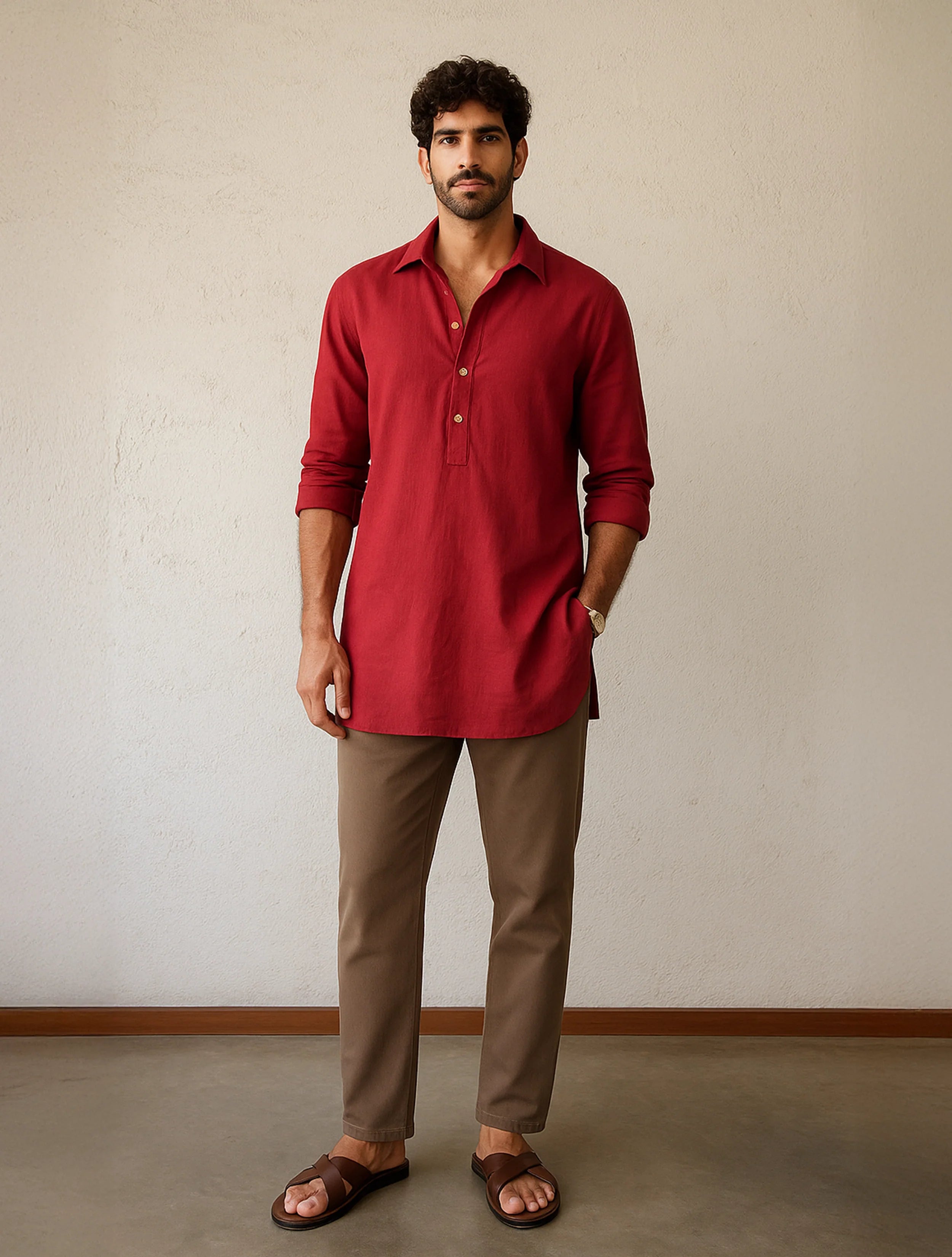 Upgrade your festive wardrobe with this elegant maroon cotton kurta, featuring a classic shirt collar, mid-thigh length and full sleeves.
