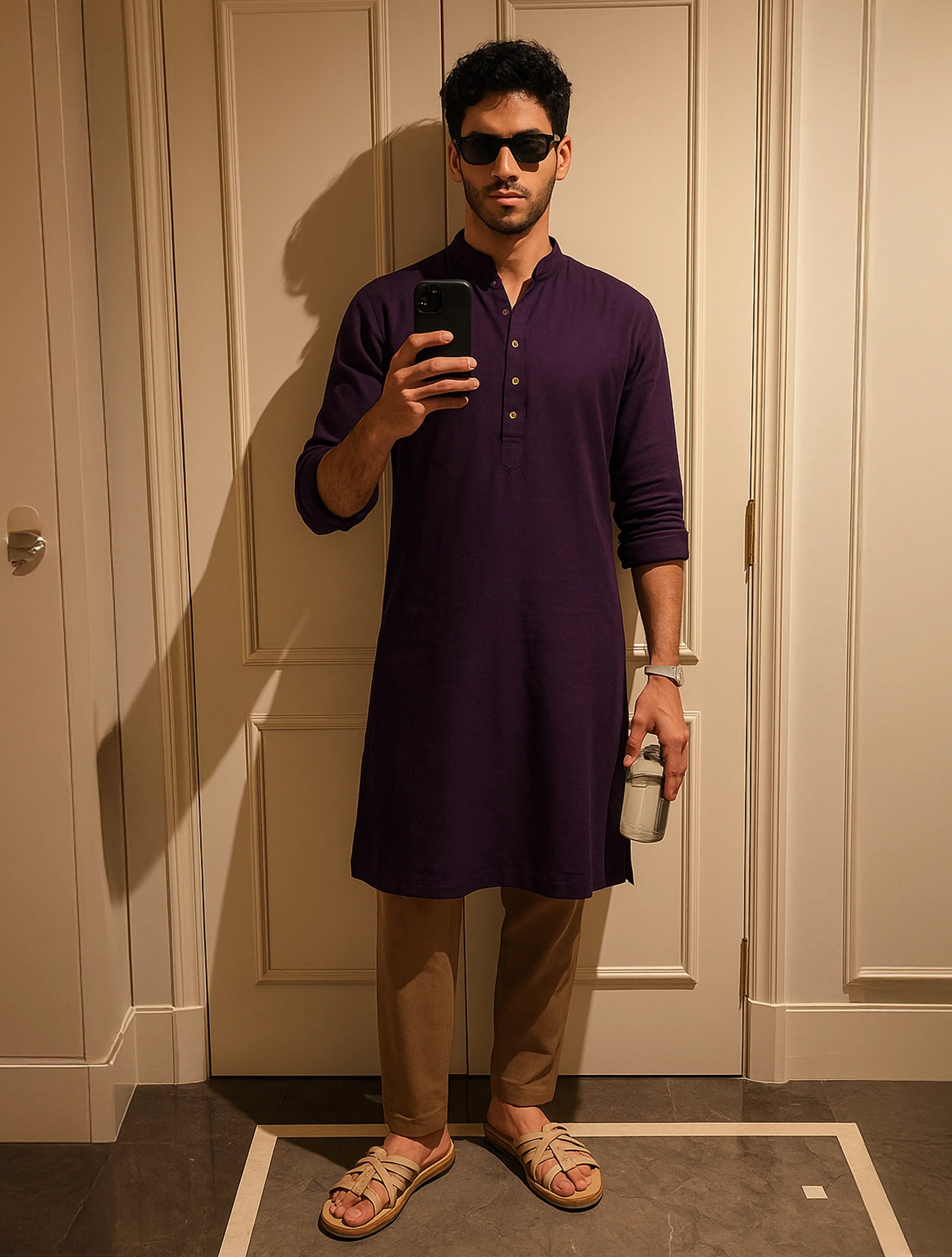 Upgrade your festive wardrobe with this elegant purple cotton kurta, featuring a classic mandarin collar, knee length and full sleeves.