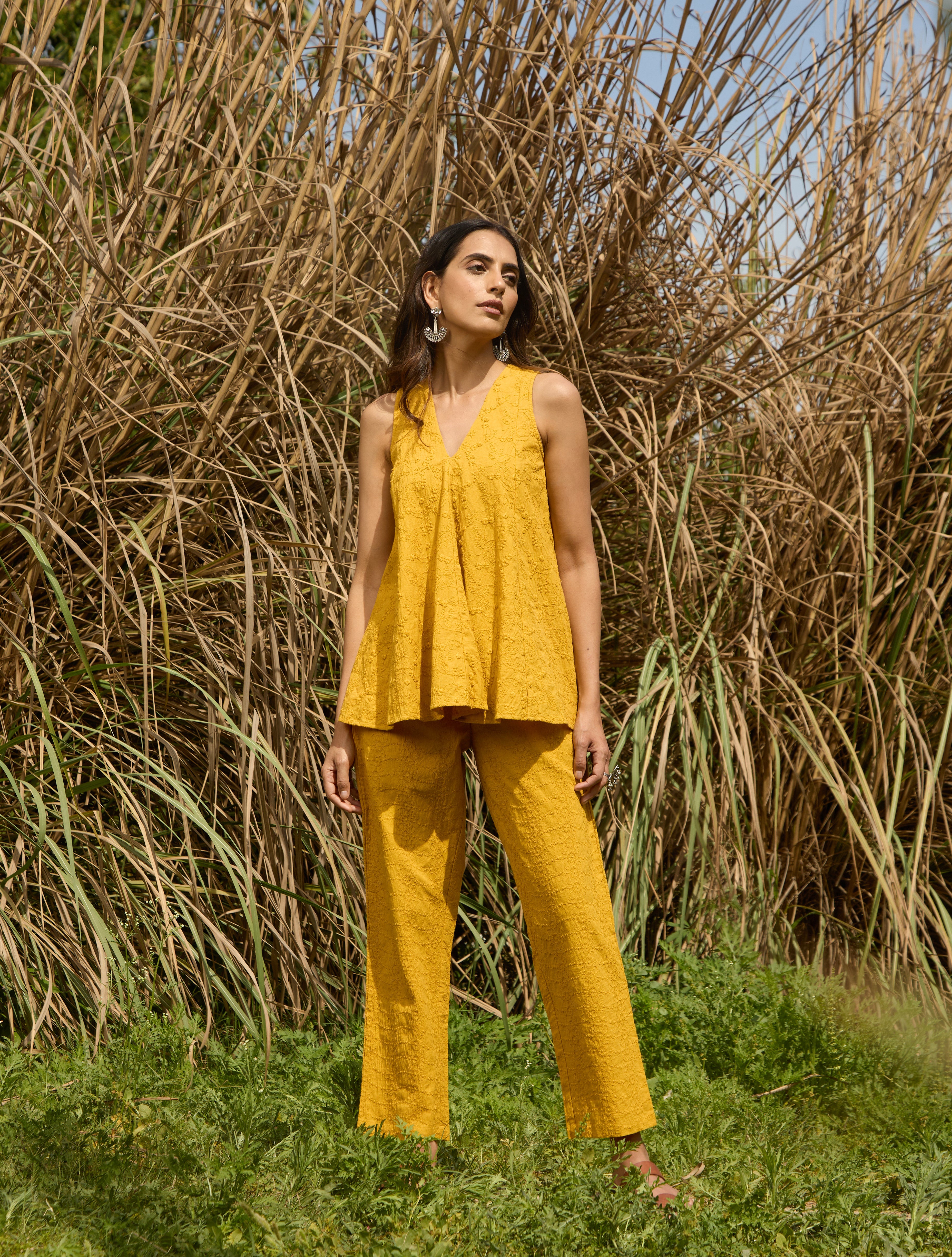 - Cotton embroidered flared sleeveless co-ord set with V-neckline. Paired with half elasticated waist pant.