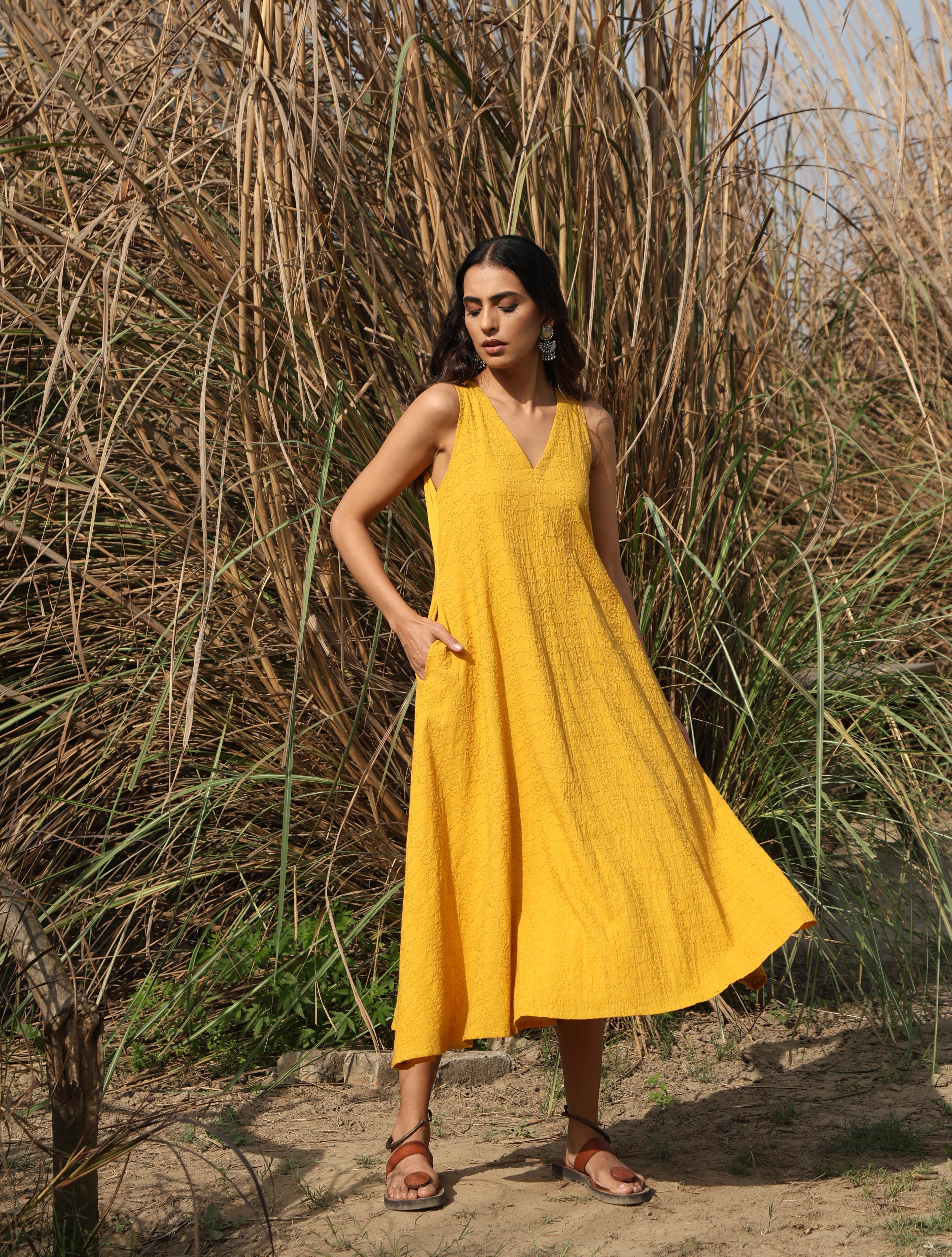 - Cotton embroidered sleeveless dress with V-neckline.