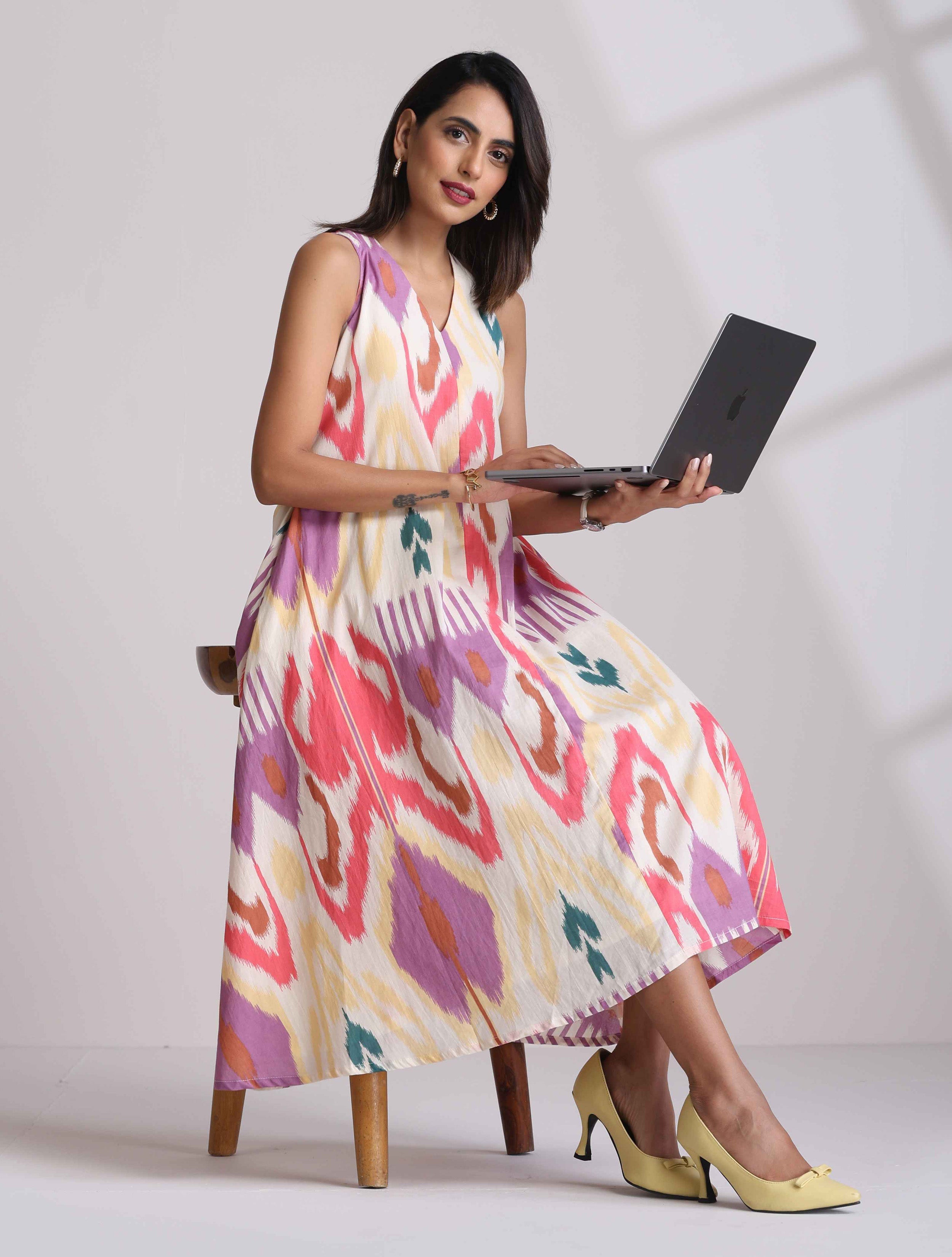- Cotton Ikat Geometric Printed Sleeveless Dress in flared fit.