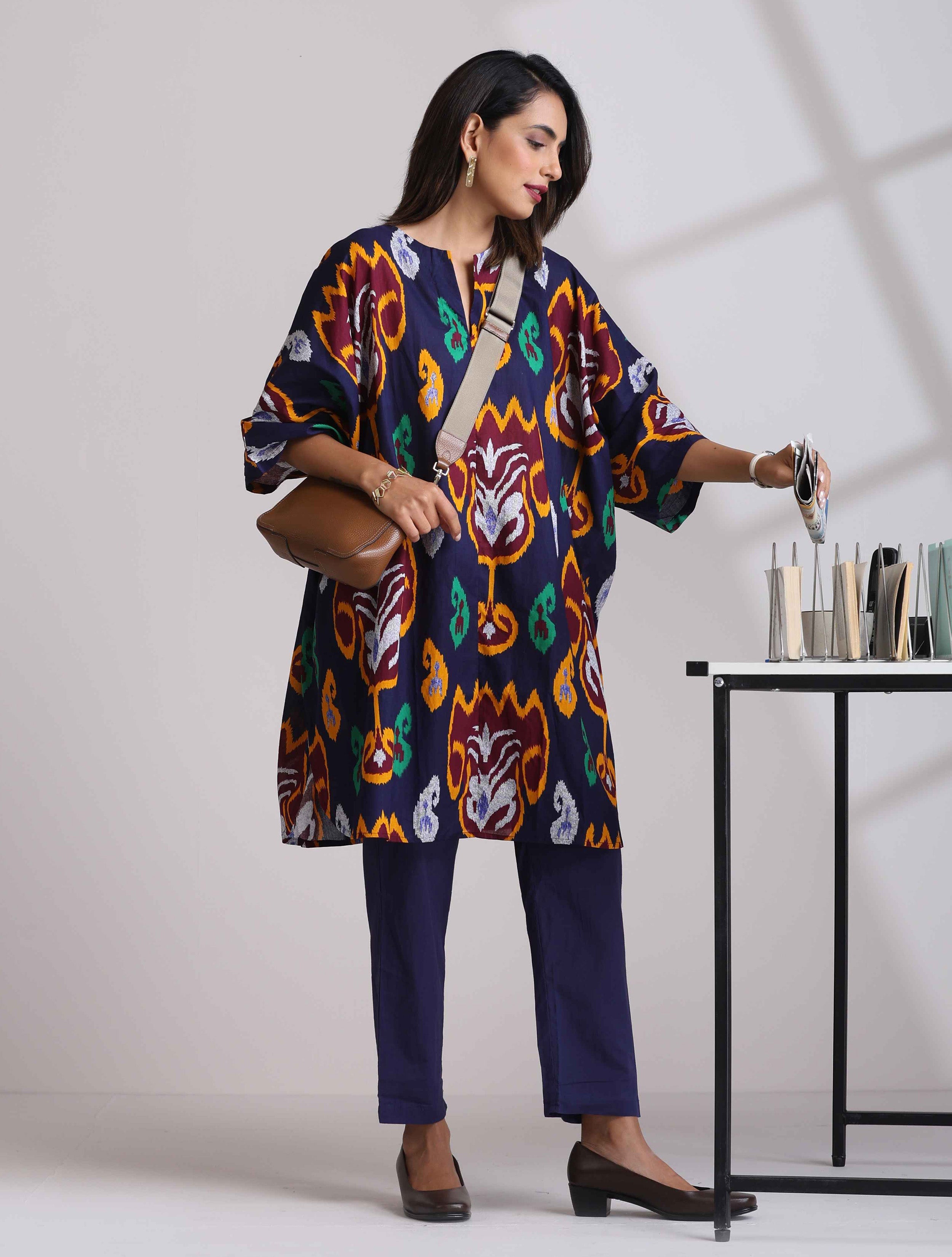- Cotton Ikat Floral Printed Kaftan Co-ord Set with round neck slit. Paired with solid elasticated waist pant. Style with pair of mules to complete the look.