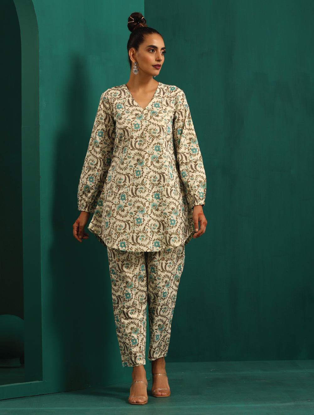 - Cotton Floral Printed Co-Ord Set with V- neck and gathered sleeve. Paired with elasticated waist pant.