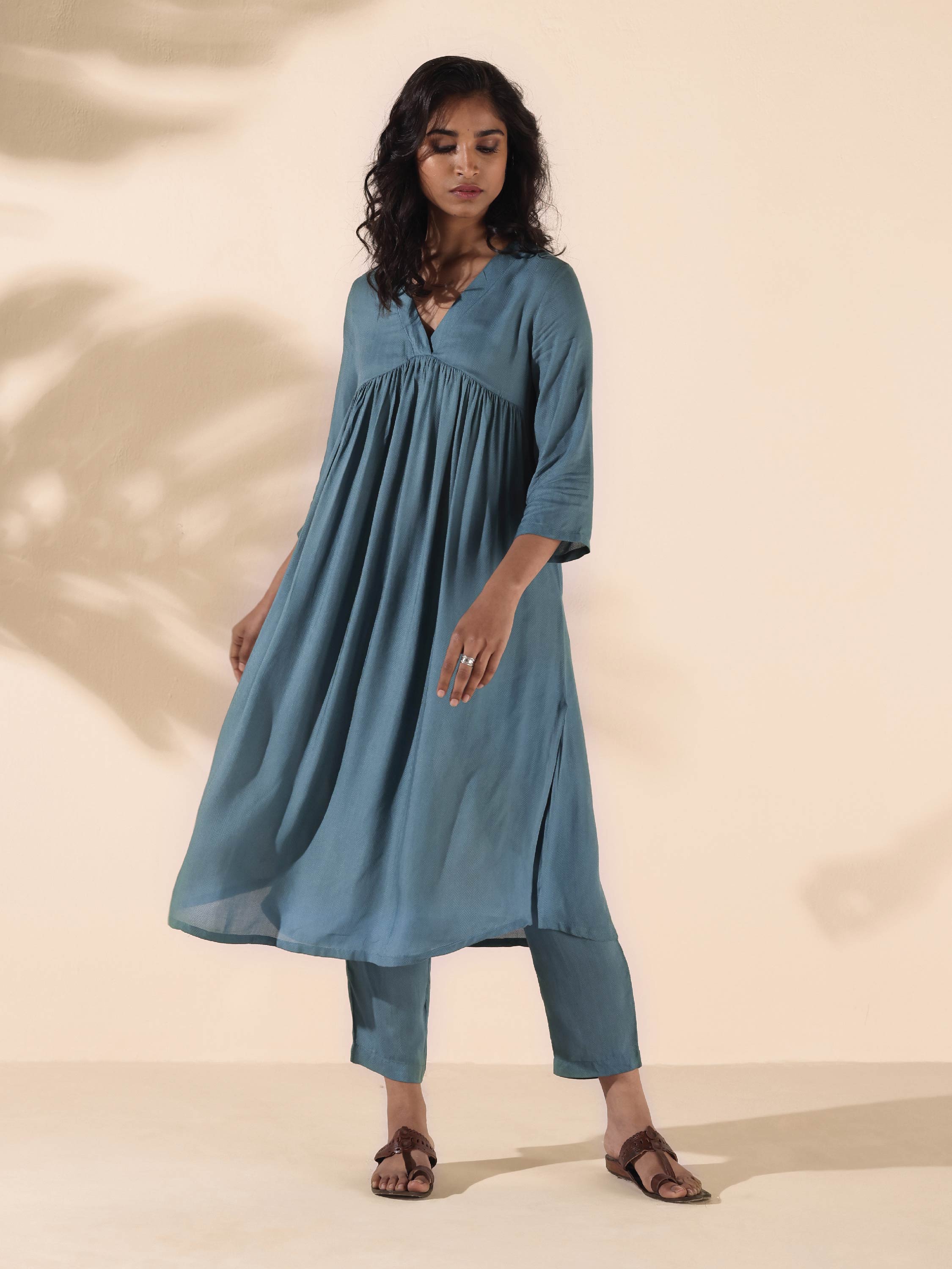 - Viscose Dobby Kurta with gathered yoke, V-neckline and slit. Paired with elasticated waist pant.